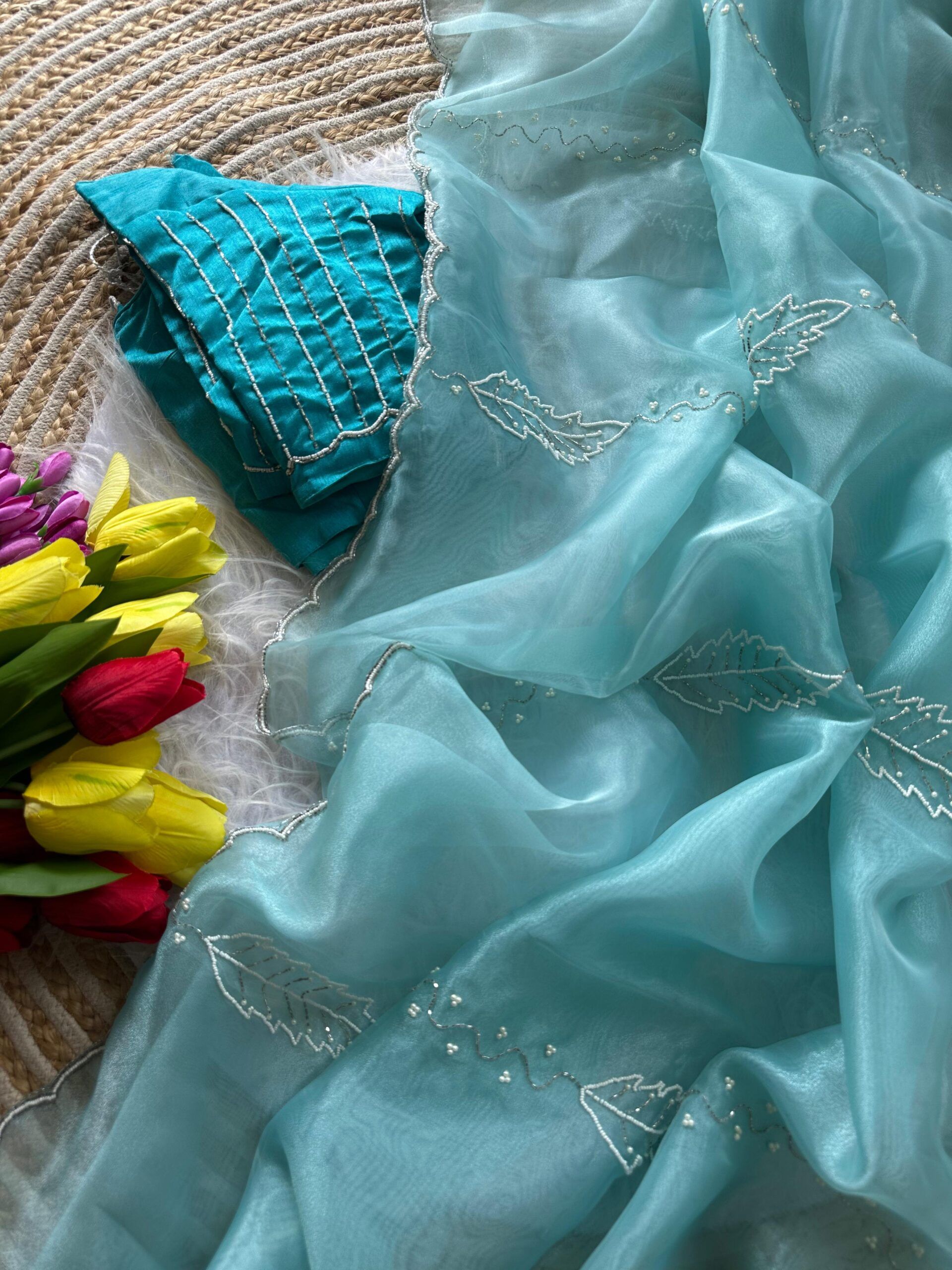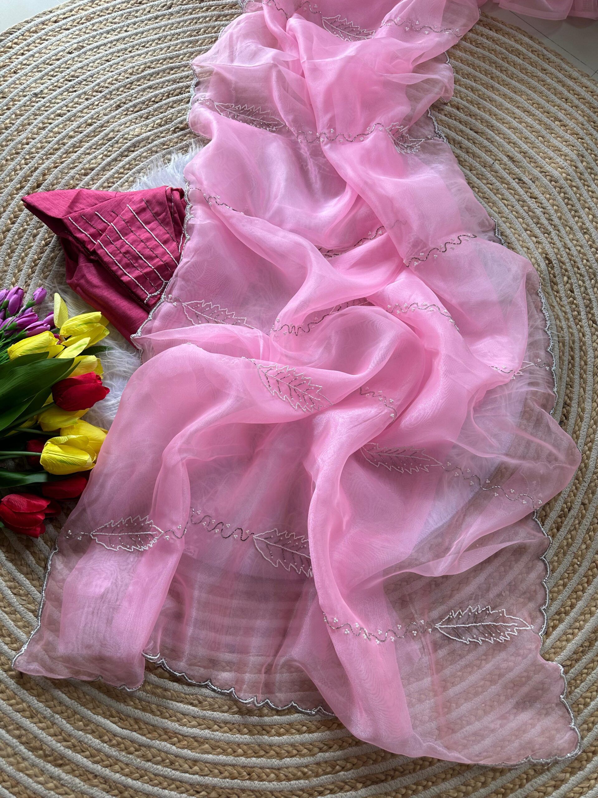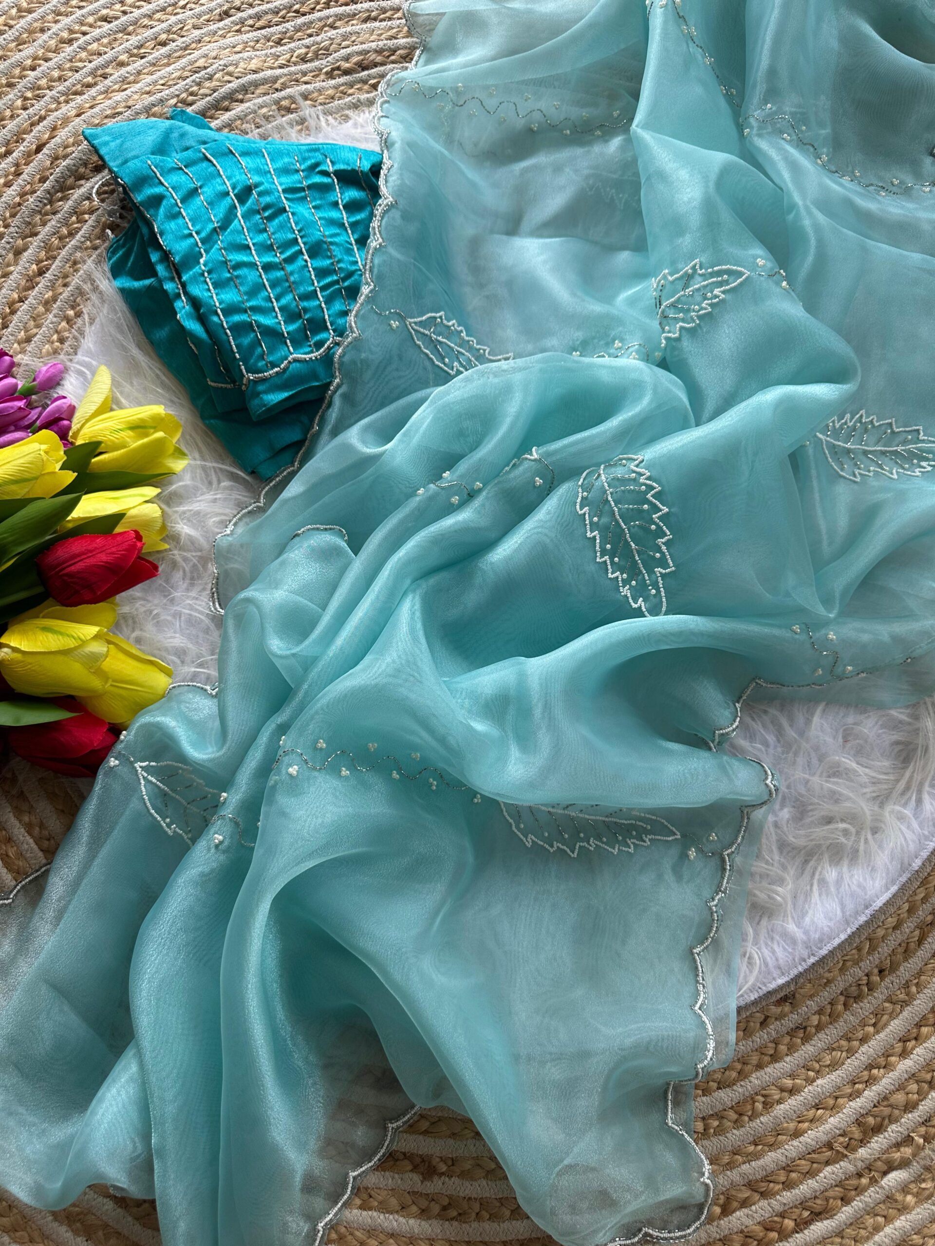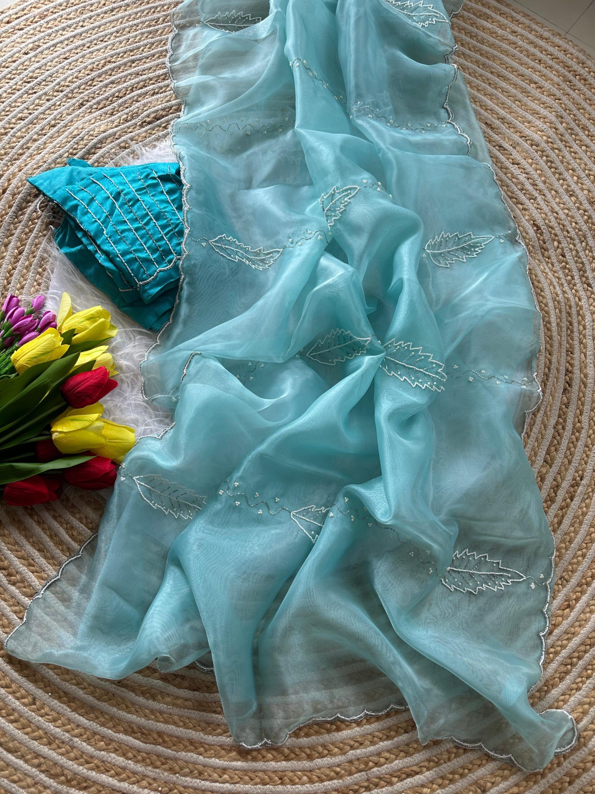 | Fabric: | Pure soft Organza silk saree with amazing Hand work of moti and cutwork.. |
