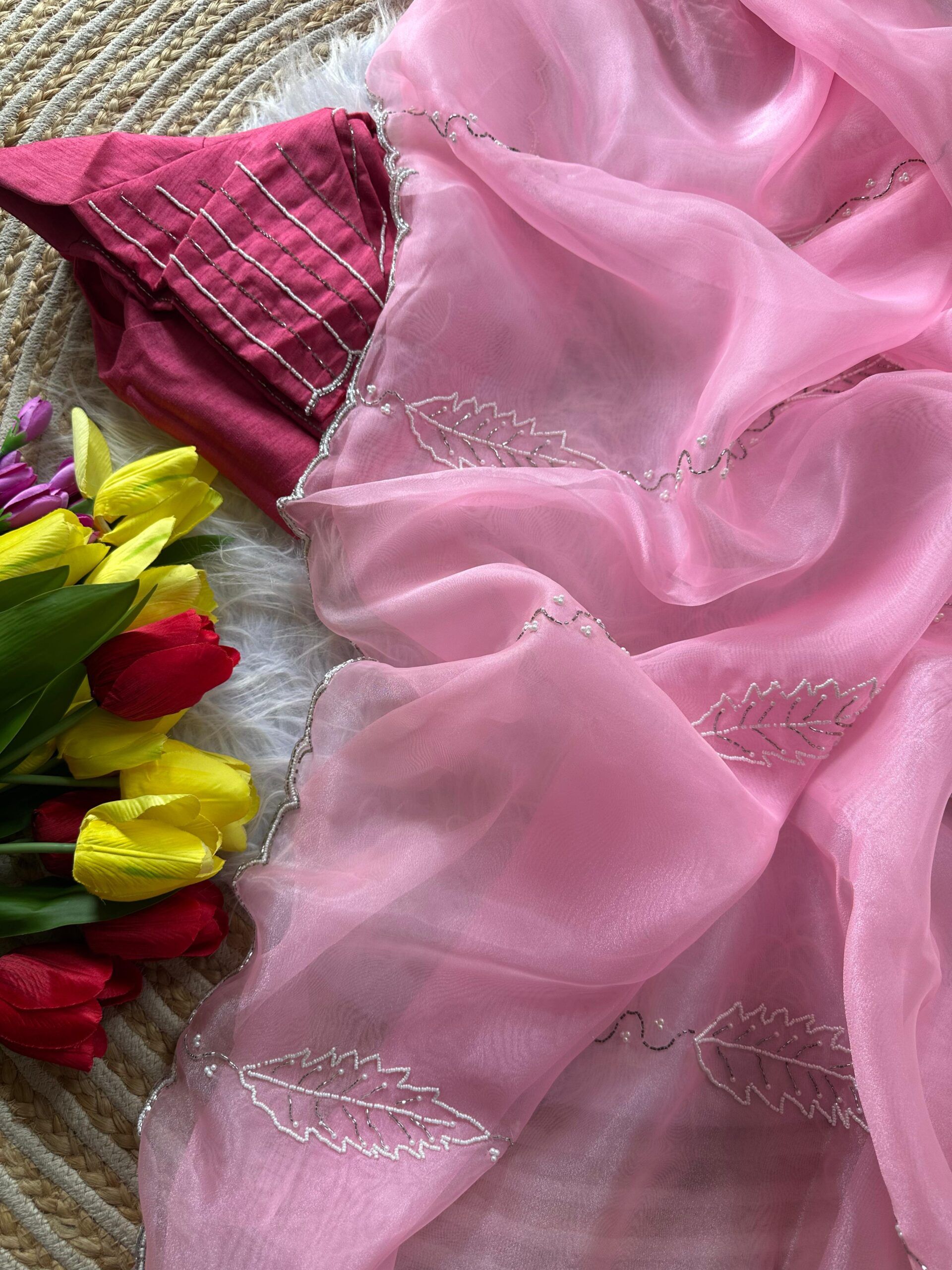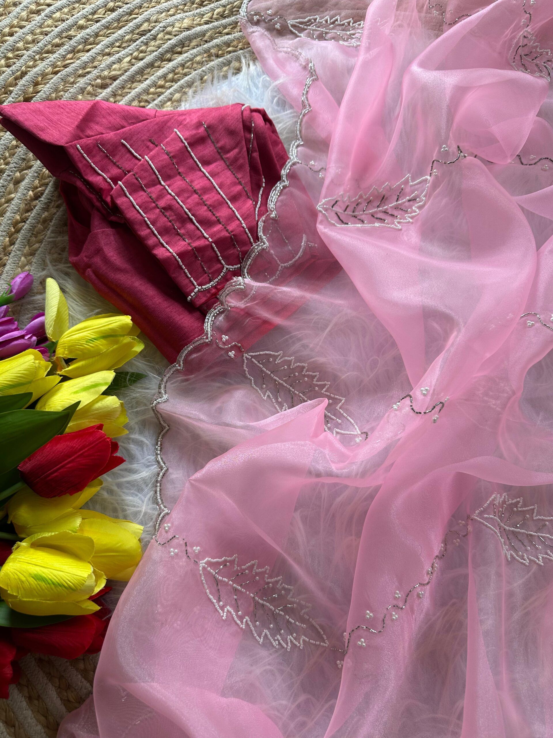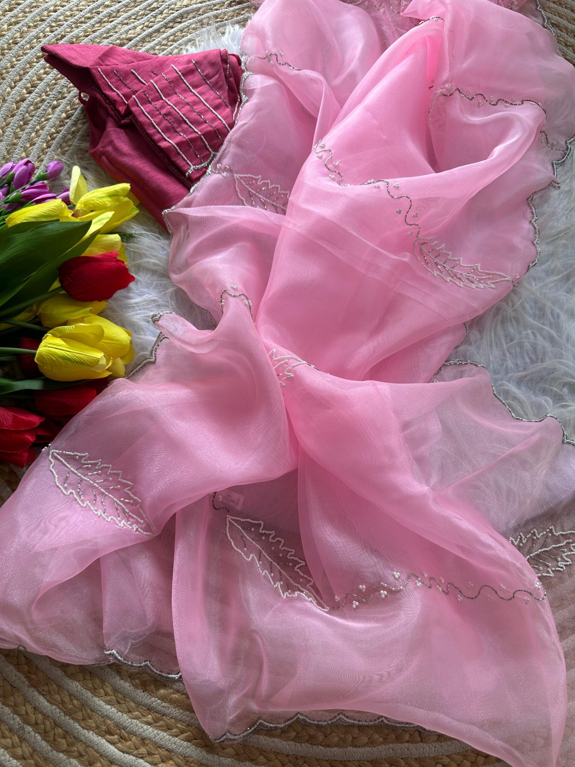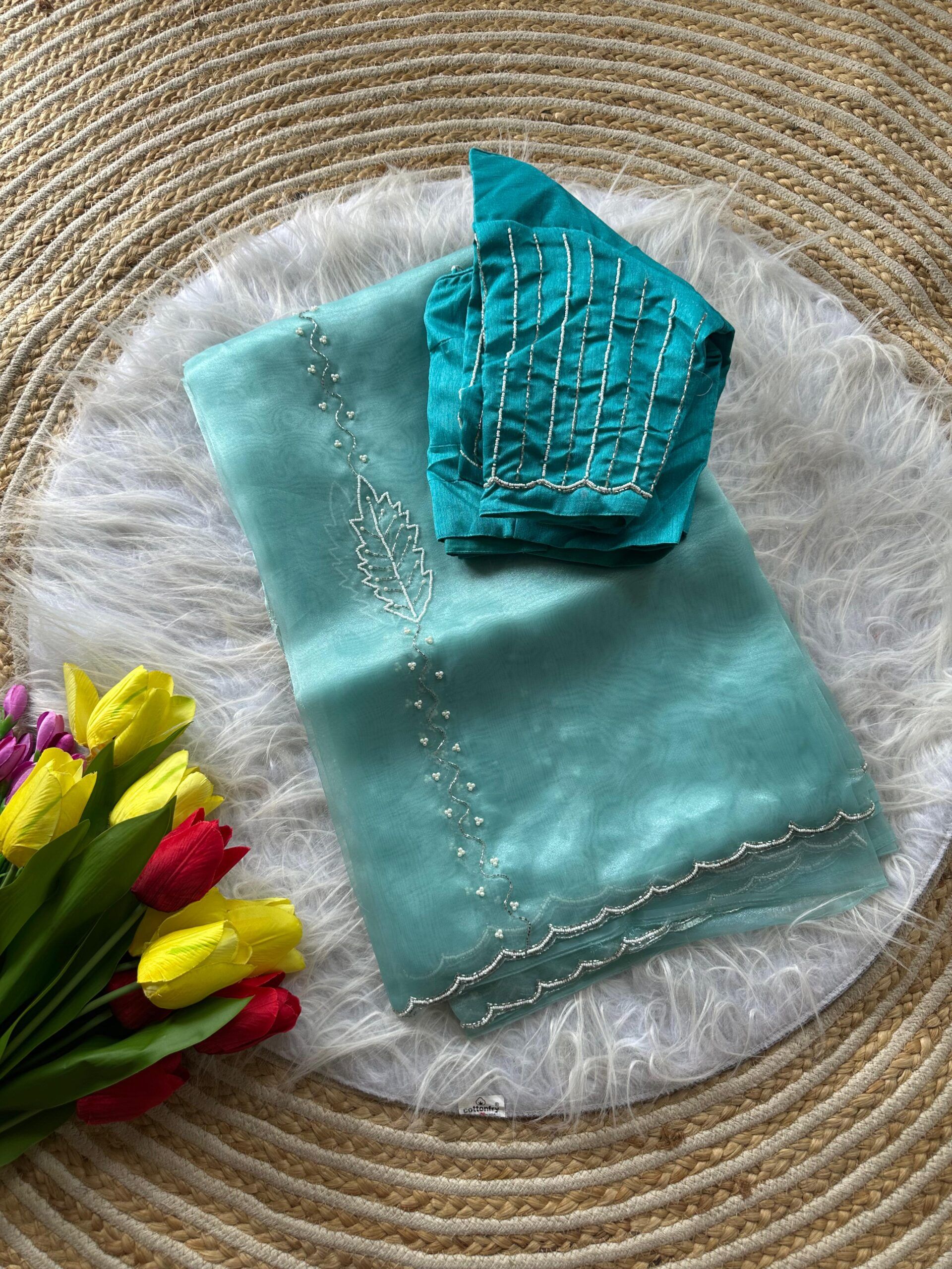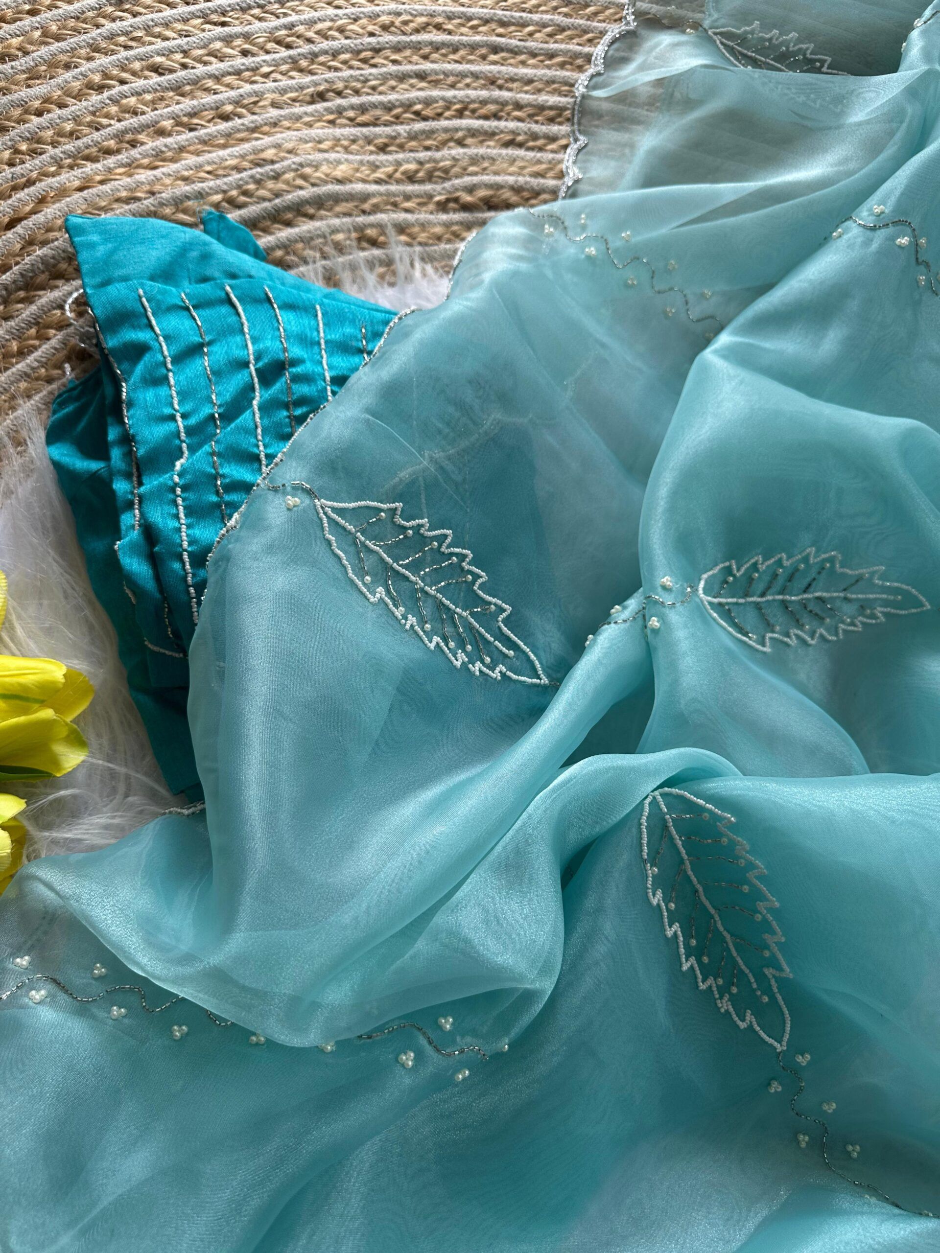 | Fabric: | Pure soft Organza silk saree with amazing Hand work of moti and cutwork.. |