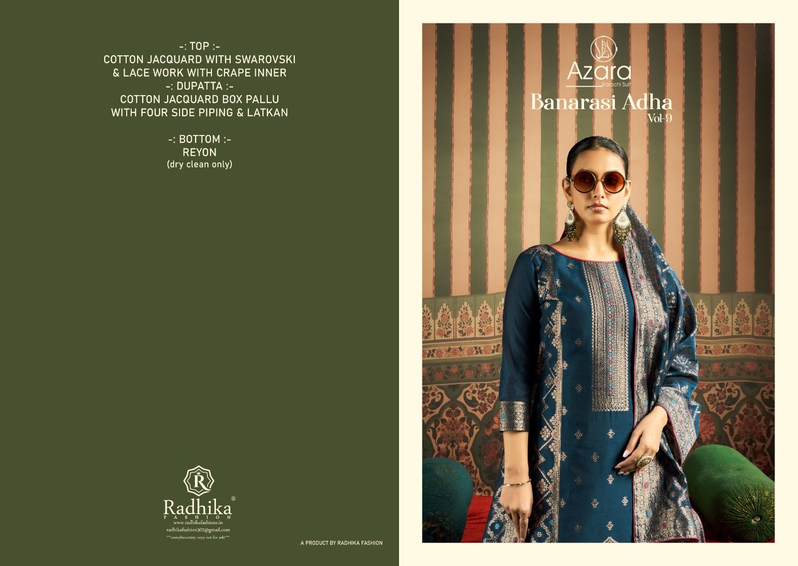 Name: Radhika Azara Banarasi Adah 9 Cotton jaqared Dress Materials