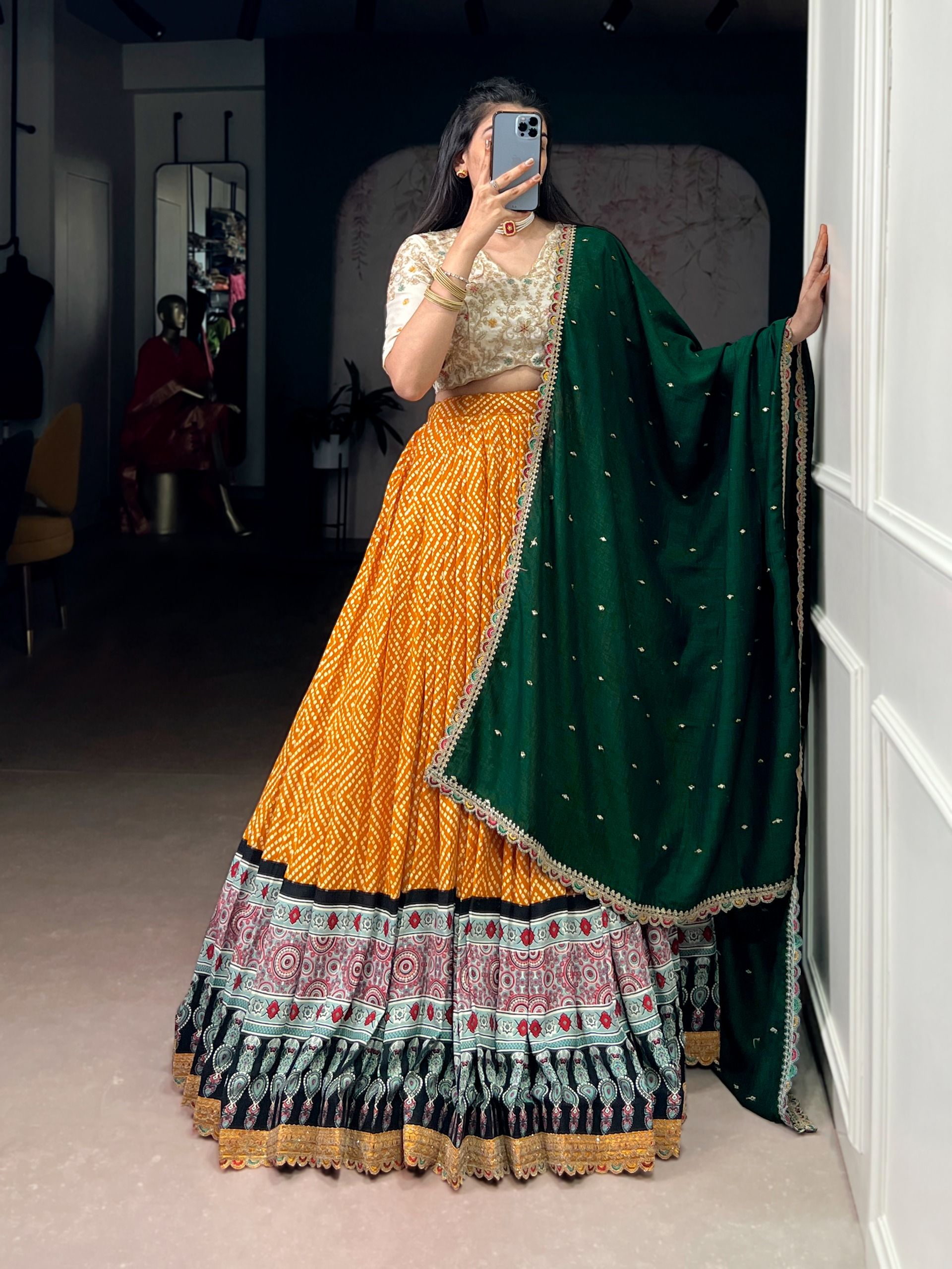 | Lehenga (Stitched) | Lehenga (Stitched) Lehenga Fabric : Rayon Lehenga Work : Bandhej And Ajarakh Print With Sequins and Thread Embroidery Lace Touch up Lehenga Waist : SUPPORTED UP TO 42 Lehenga Closer : Drawstring With Zip Stitching : Stitched With Canvas Length : 41 Flair : 4 Meter Inner : Micro Crepe |