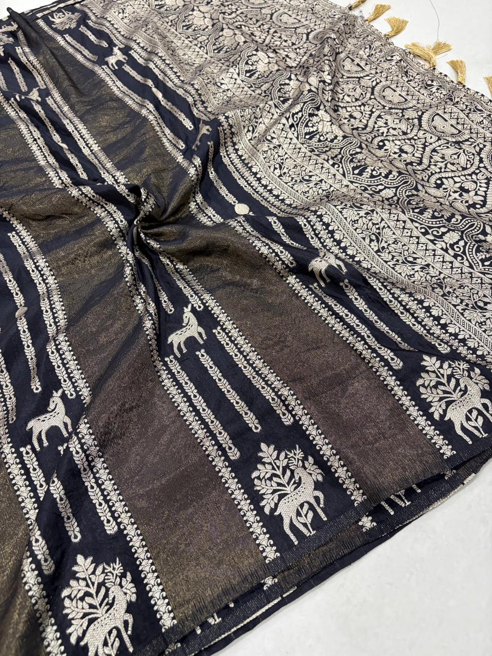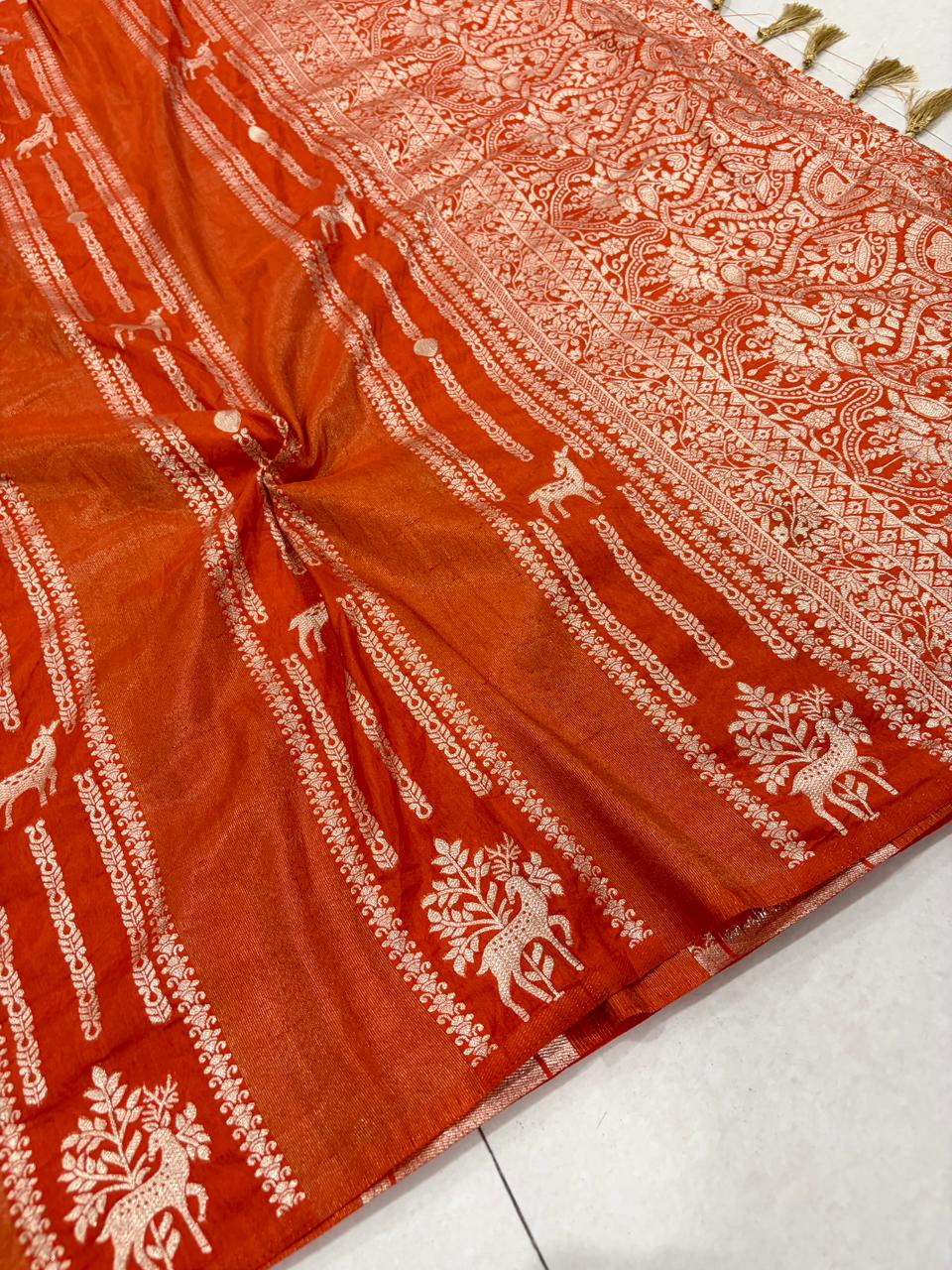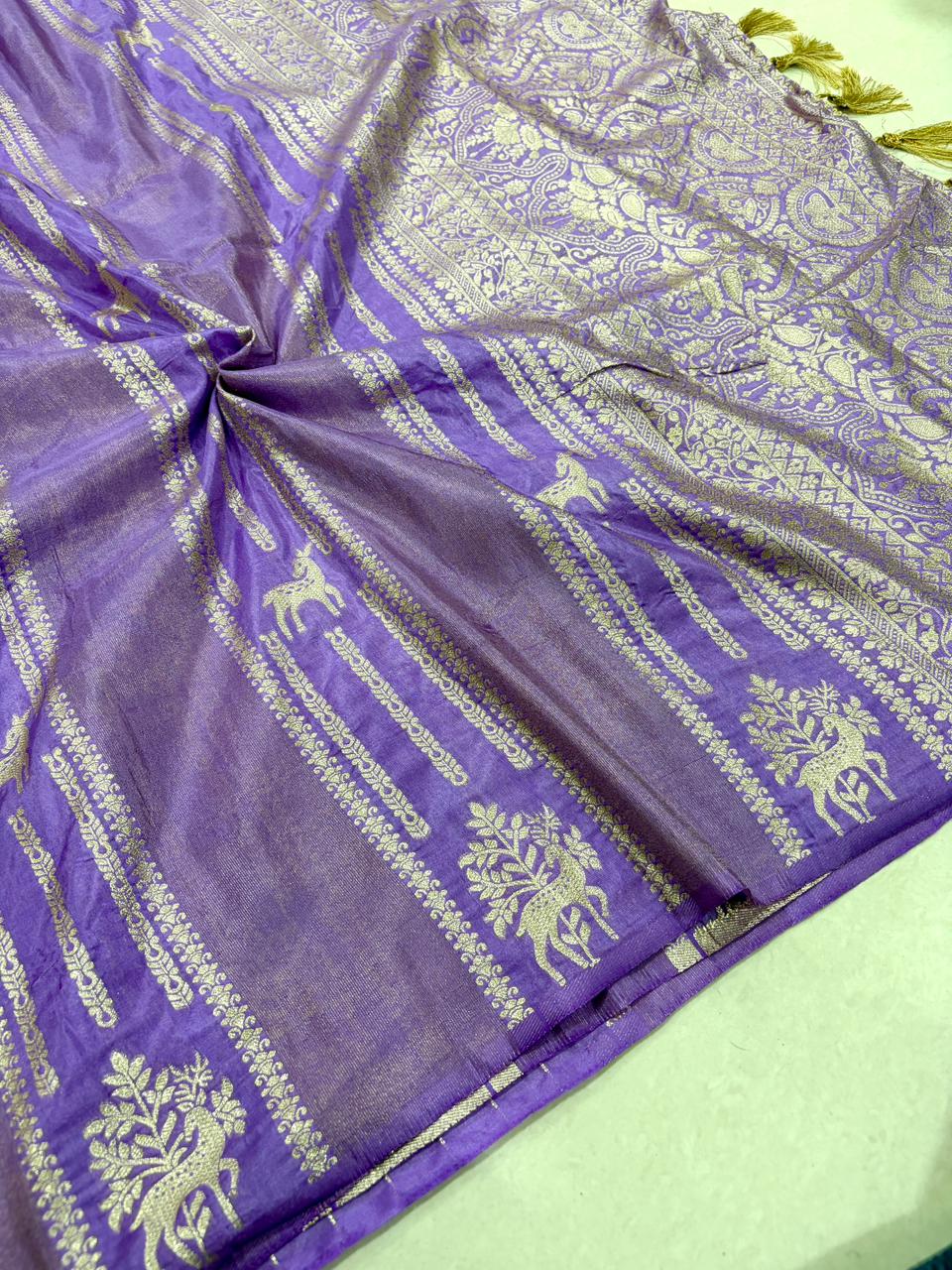 | Fabric: | Rich Crepe Khadi cottansilk saree with Rich Jari Wooven Pallu with attached tassels and Golden jari KALAKARI & peacock weaving all over the body Elegant golden jari border featuring peacock & floral motifs detailing on the border Subtle jari butti weave across the saree surface And a Hand‑dyed Product finished that Comes The saree exudes regal luxury, perfect for festive or wedding occasions. |