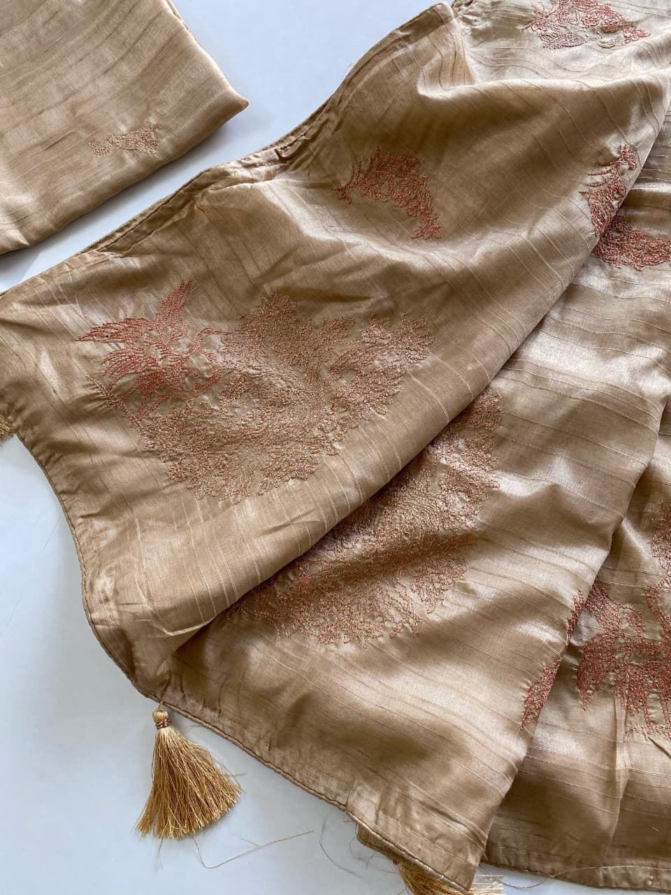 | Fabric: | A new concept of silk with zari based embroidery and piping. The fabric is soft and easy to drape. Running butti blouse design. |