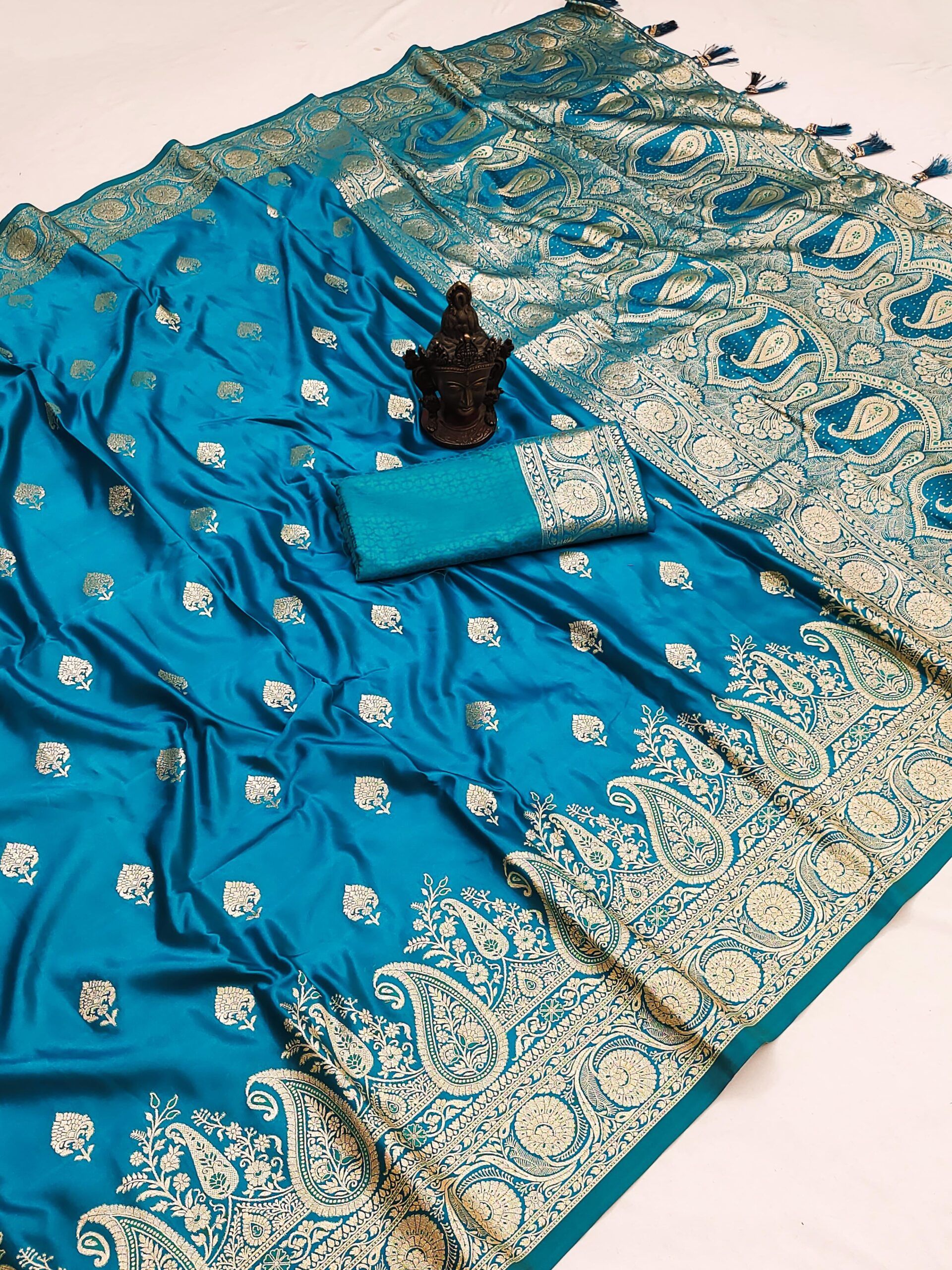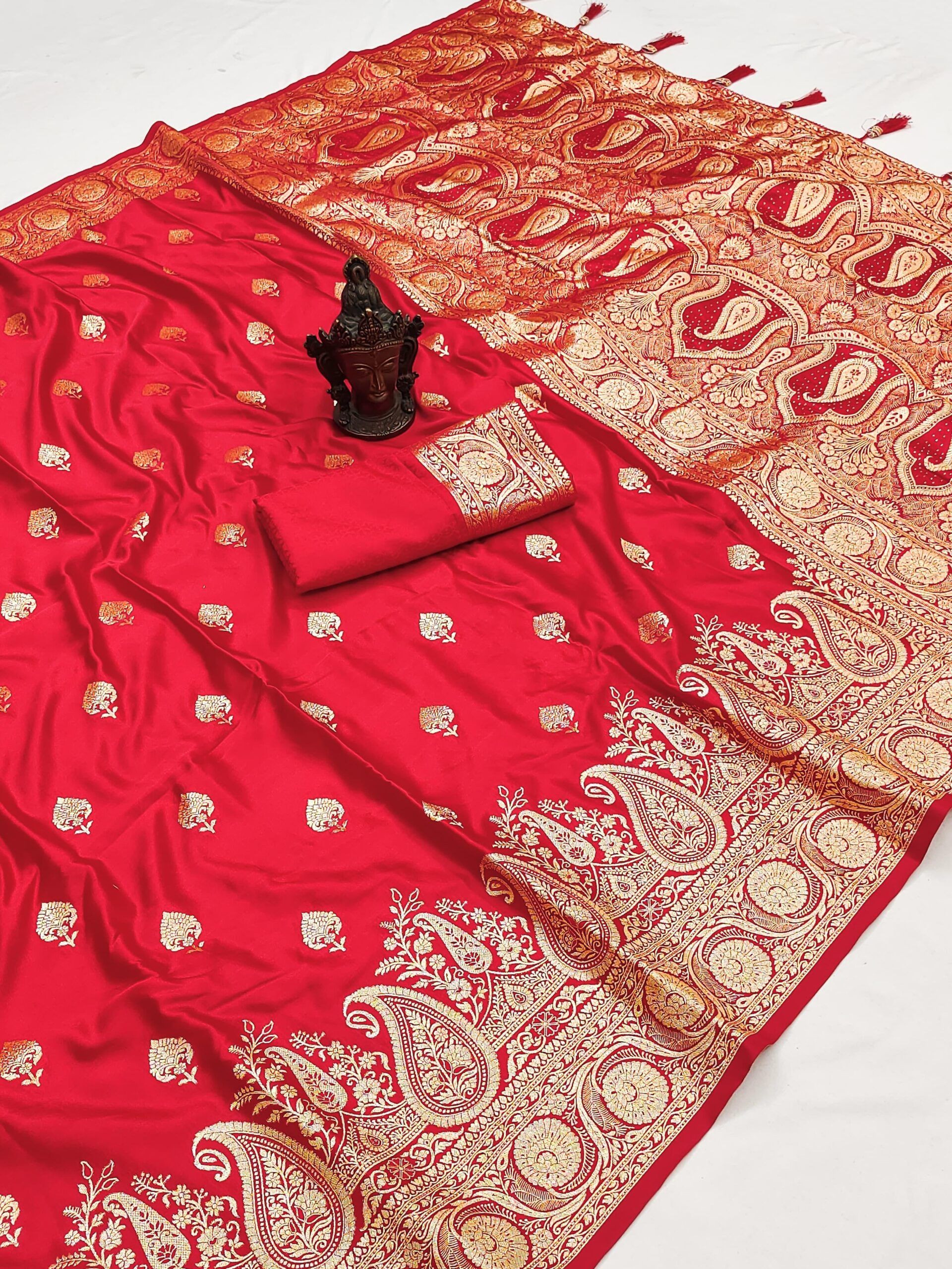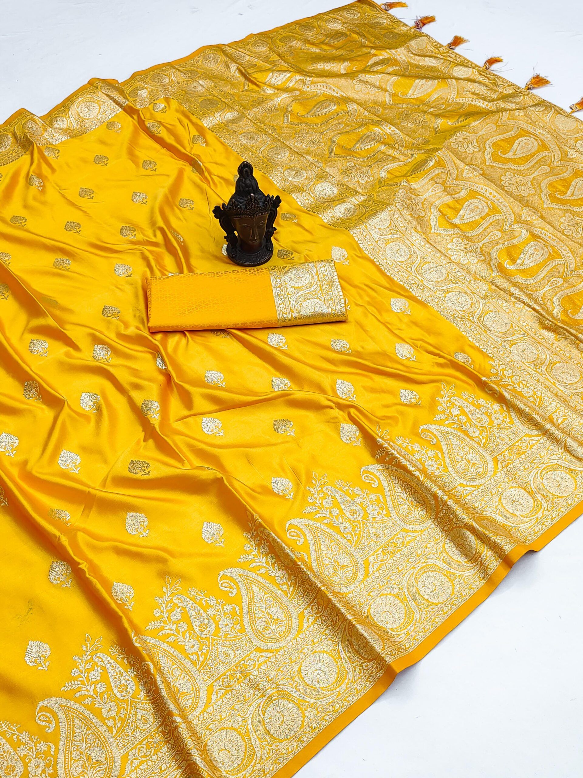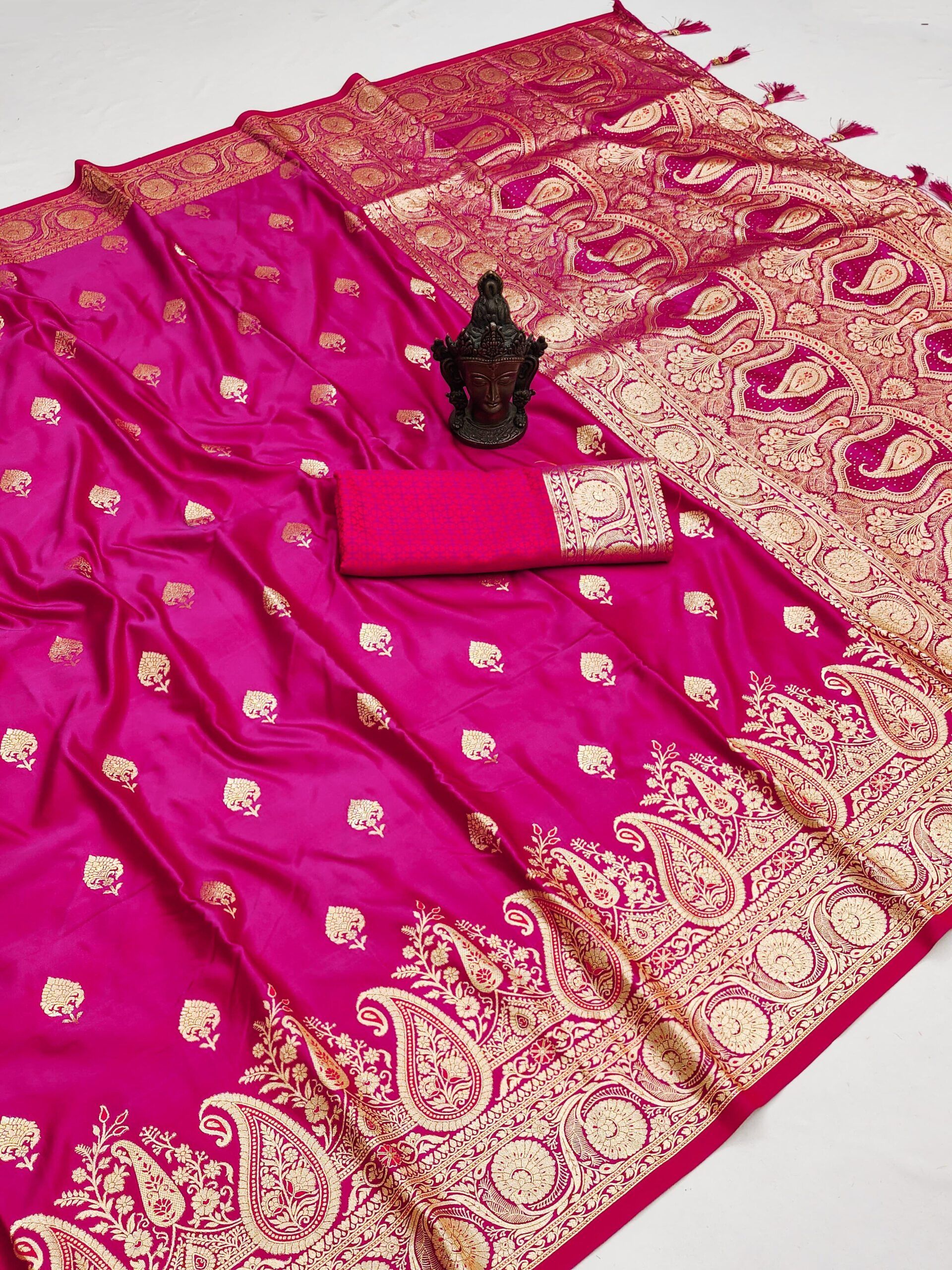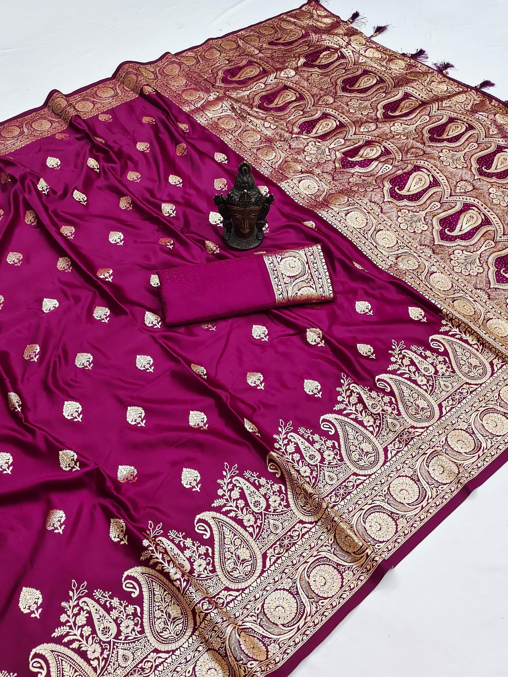 | Fabric: | Soft And Pure banarasi mashru satin silk saree with self weaving design all over the saree & zari weaving Rich pallu |