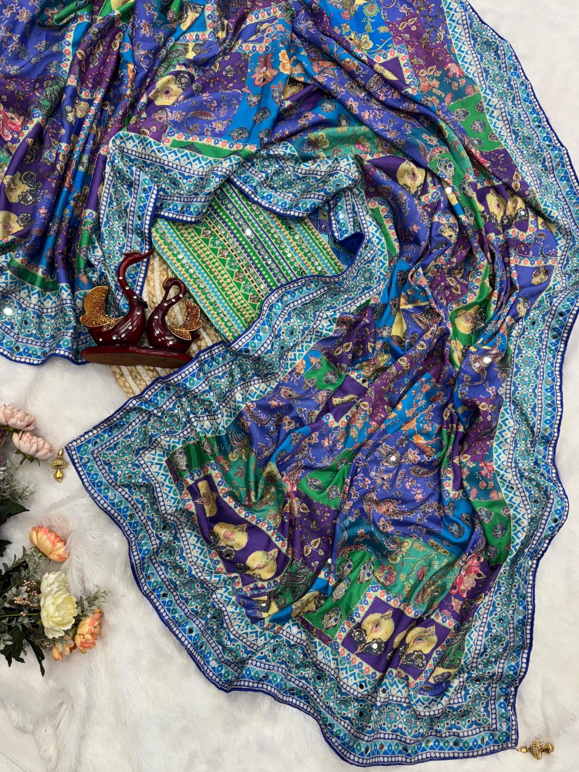 | Blouse: | Beautiful print with Real mirror in chinnon |