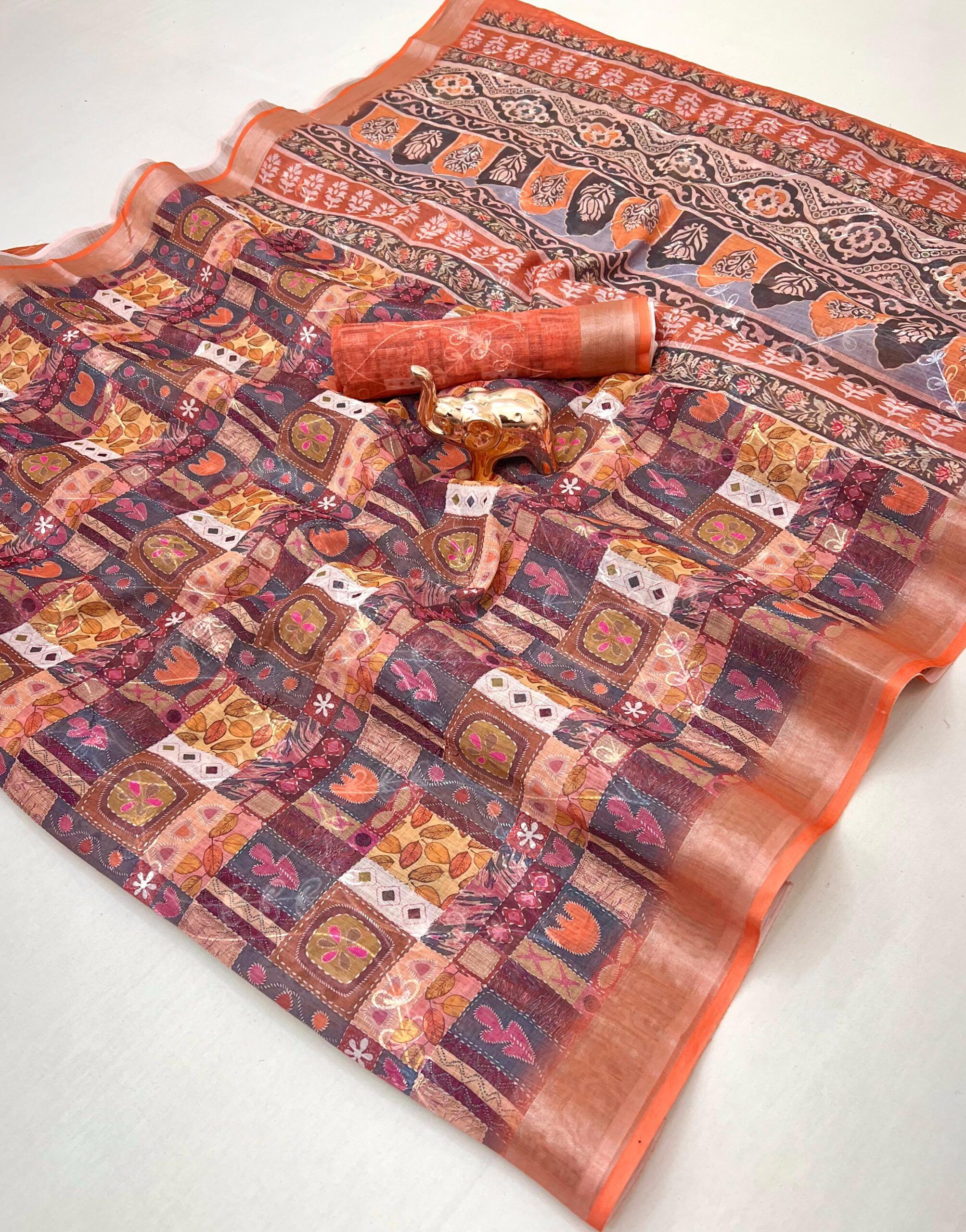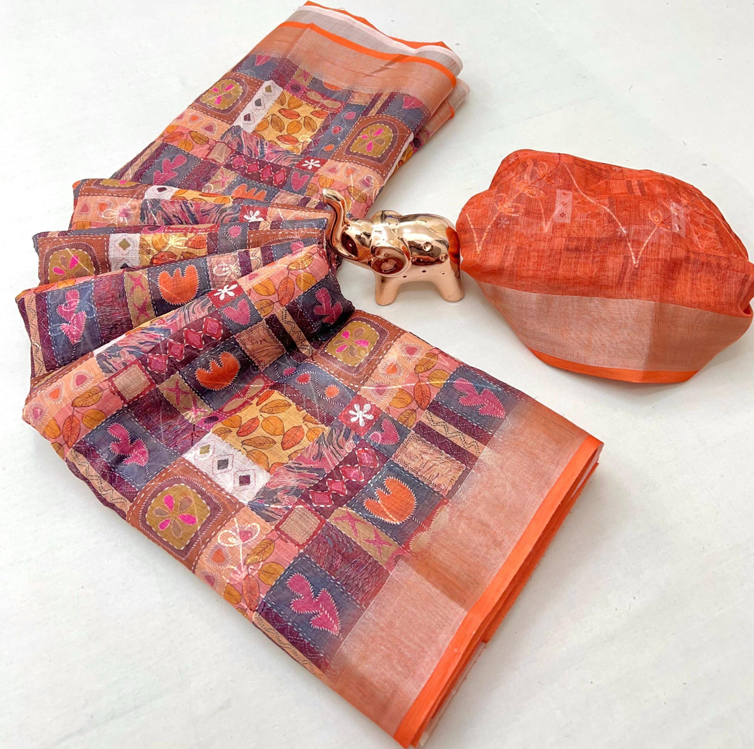 Soft Linen Digital Printed Chain Stitch Work Saree 9 Pc Catalog