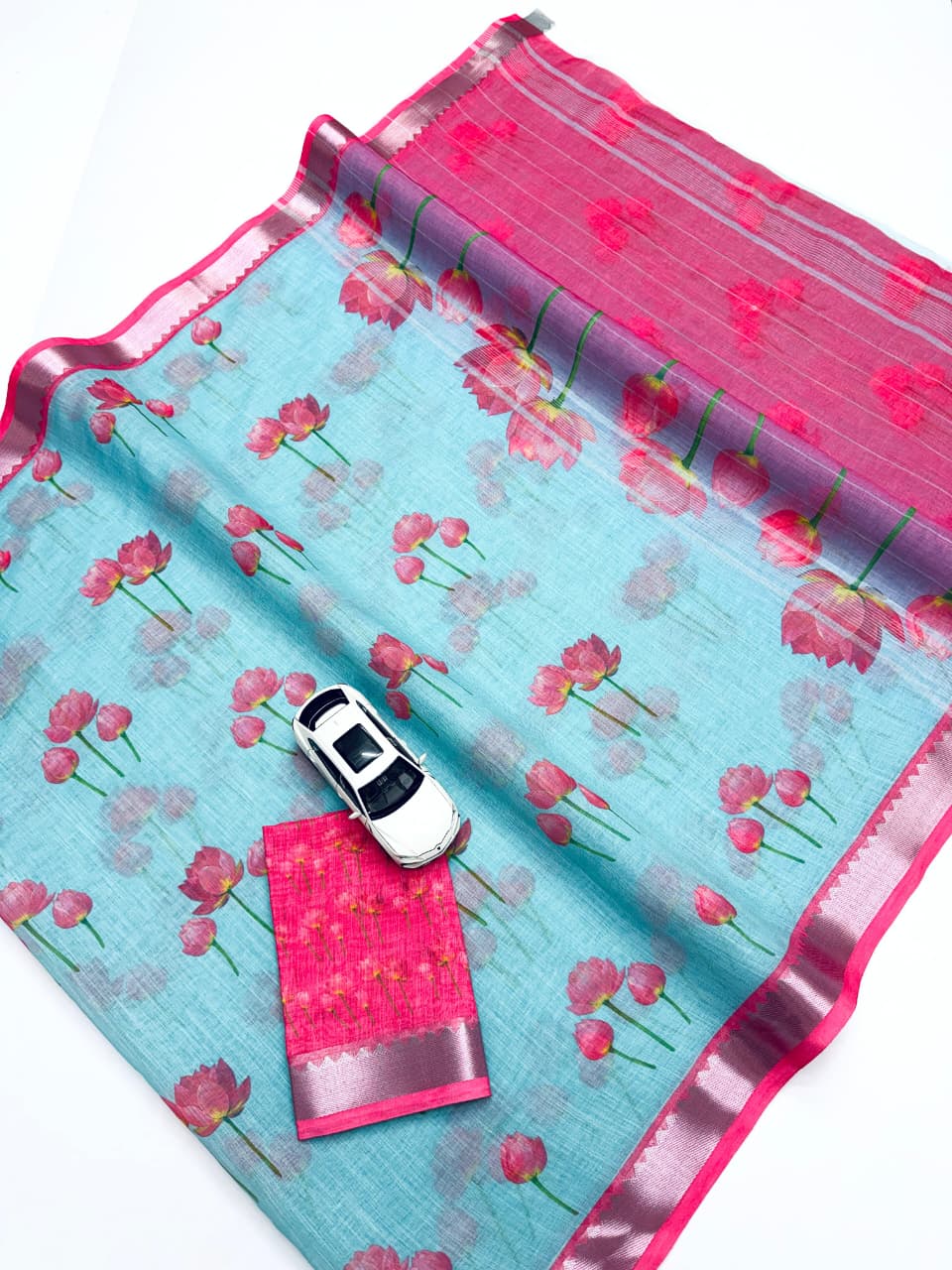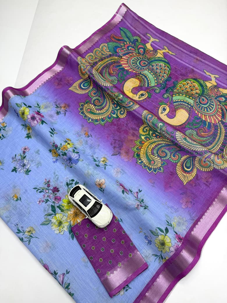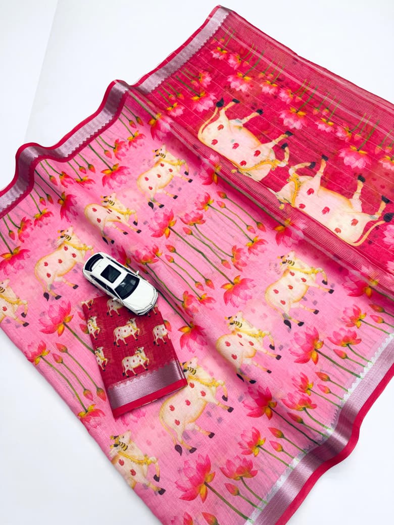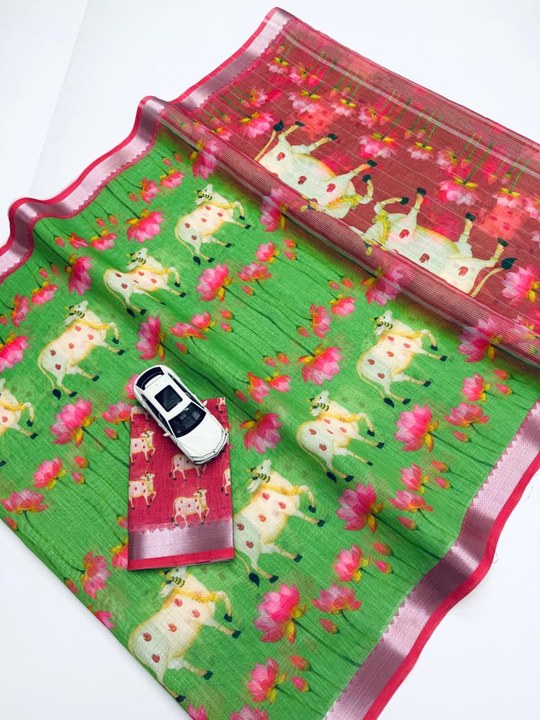 Soft Linen Digital Printed Saree With Mangalgiri Border 12 Pc Catalog