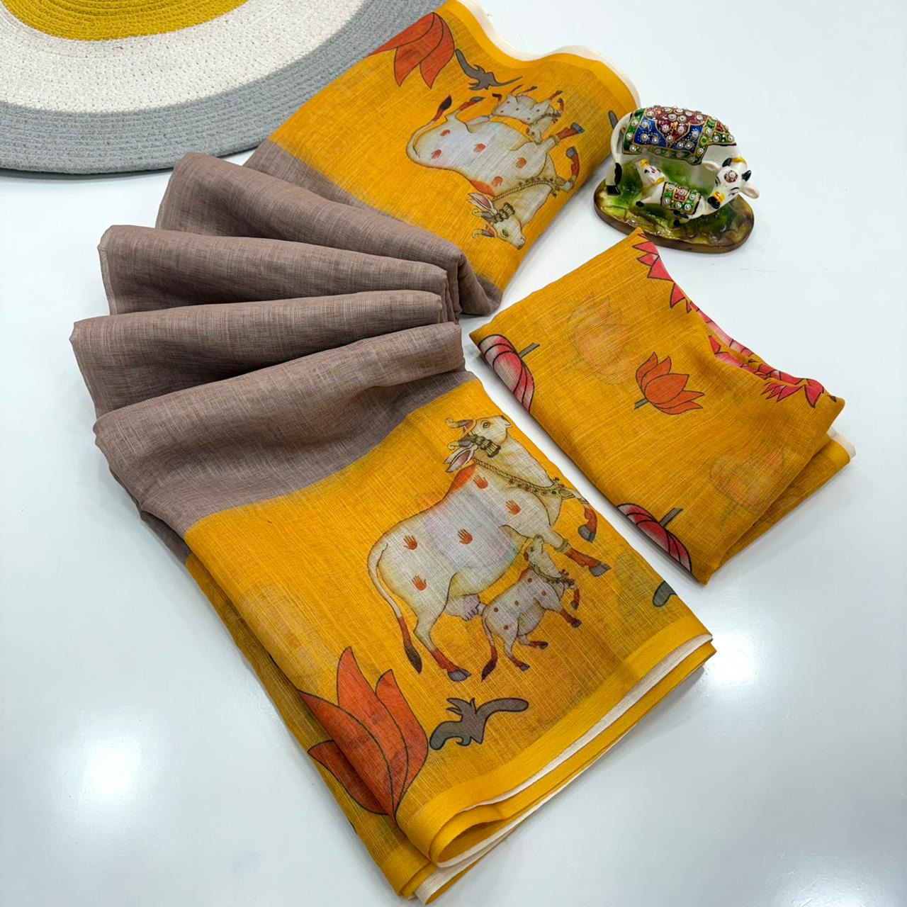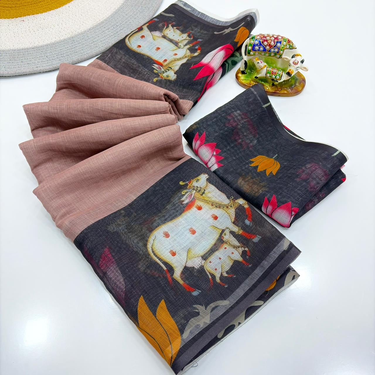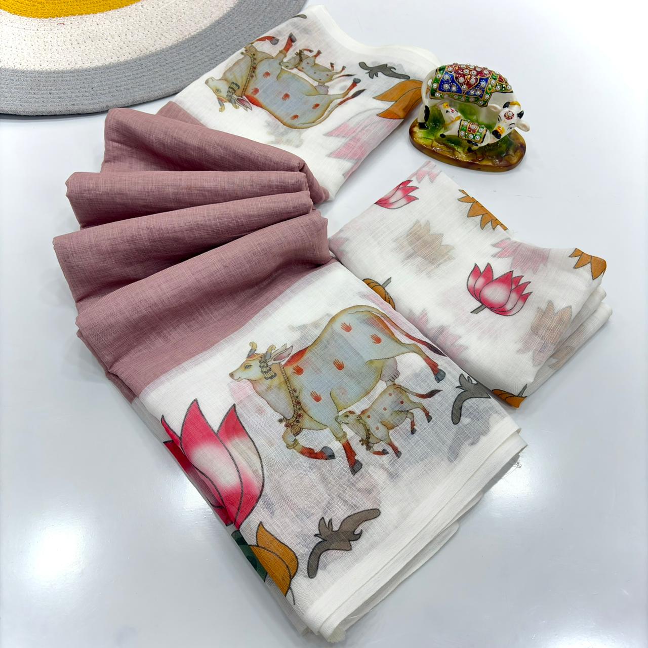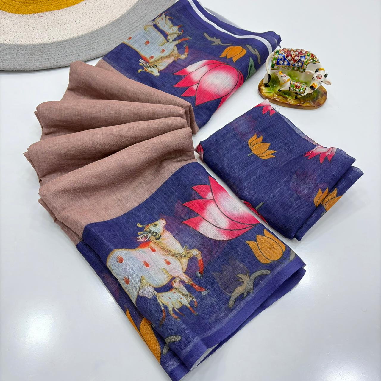 Fabric: soft linen with designer pallu and border with lotus and mother of Cow and designer blouse.
