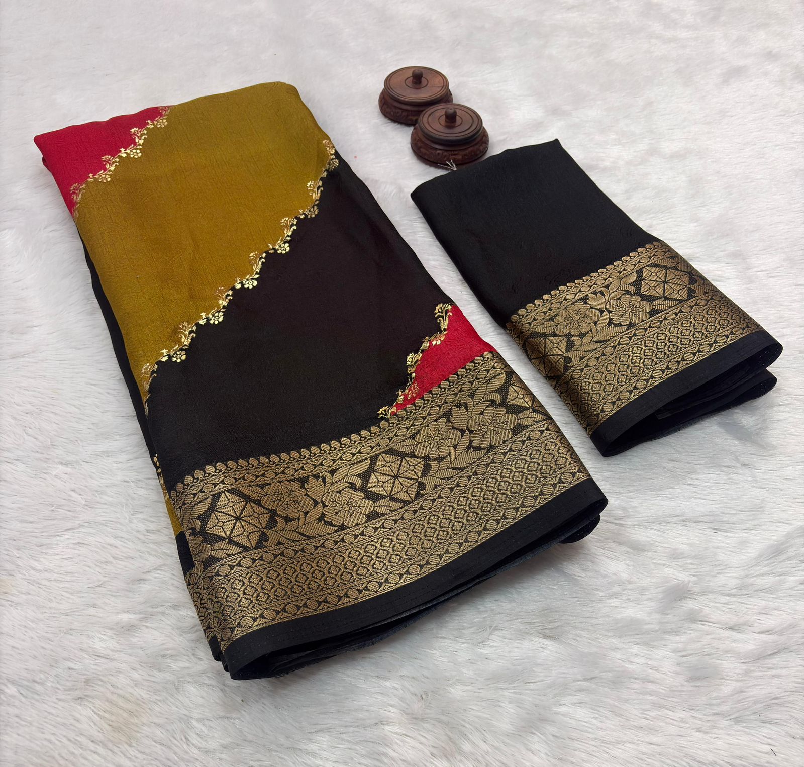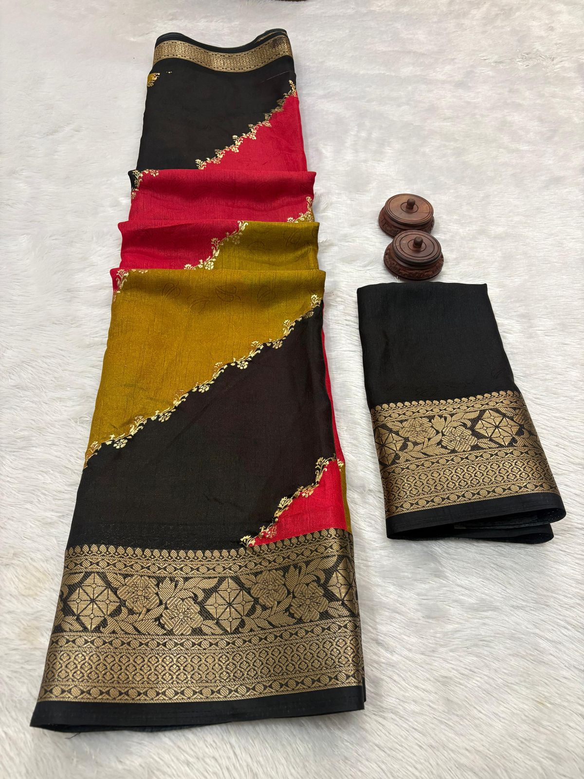 | Fabric: | SOFT MARSHMALLOW BLOOMING [ heavy jacquard weaving border and self jacquard weaving pattern and beautiful HD ikkat style print and golden foil print ] LENGTH – 6.30 METER |