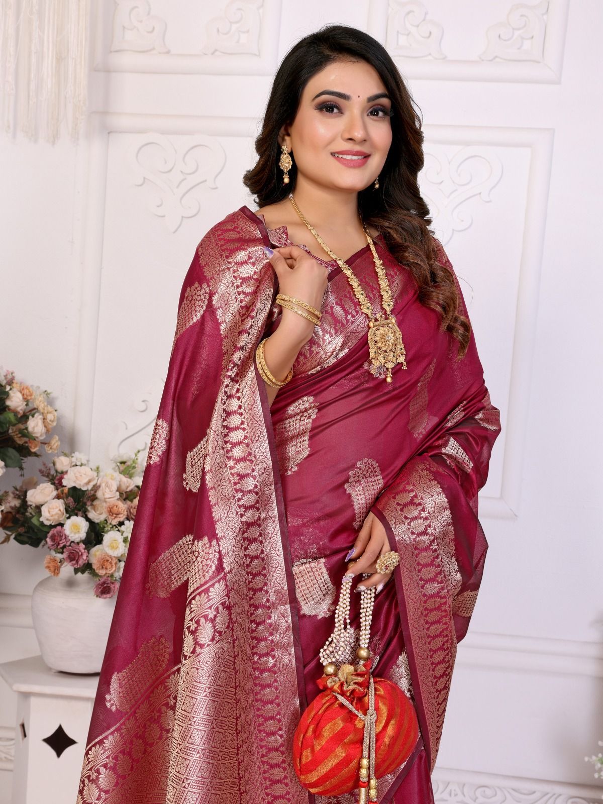 South silk and Kanjivaram sarees look great with temple jewellery. You can them with potli bags to complete your attire and will make your traditional look perfect. Clutches and purses also make for great accessories.