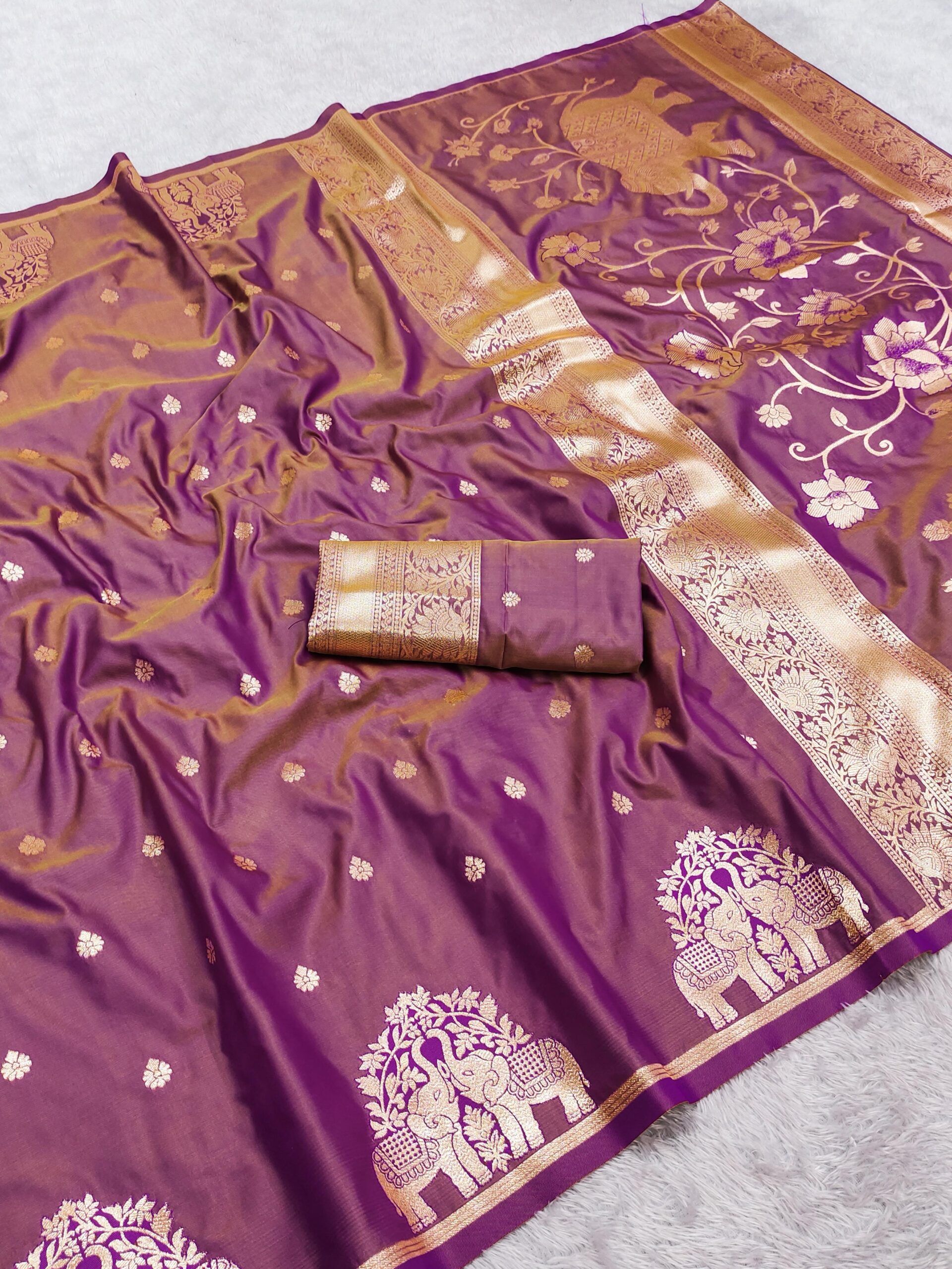 | Blouse: | Matching soft pure silk weaving blouse piece with subtle zari motifs and a coordinated rich border for a complete graceful look. |