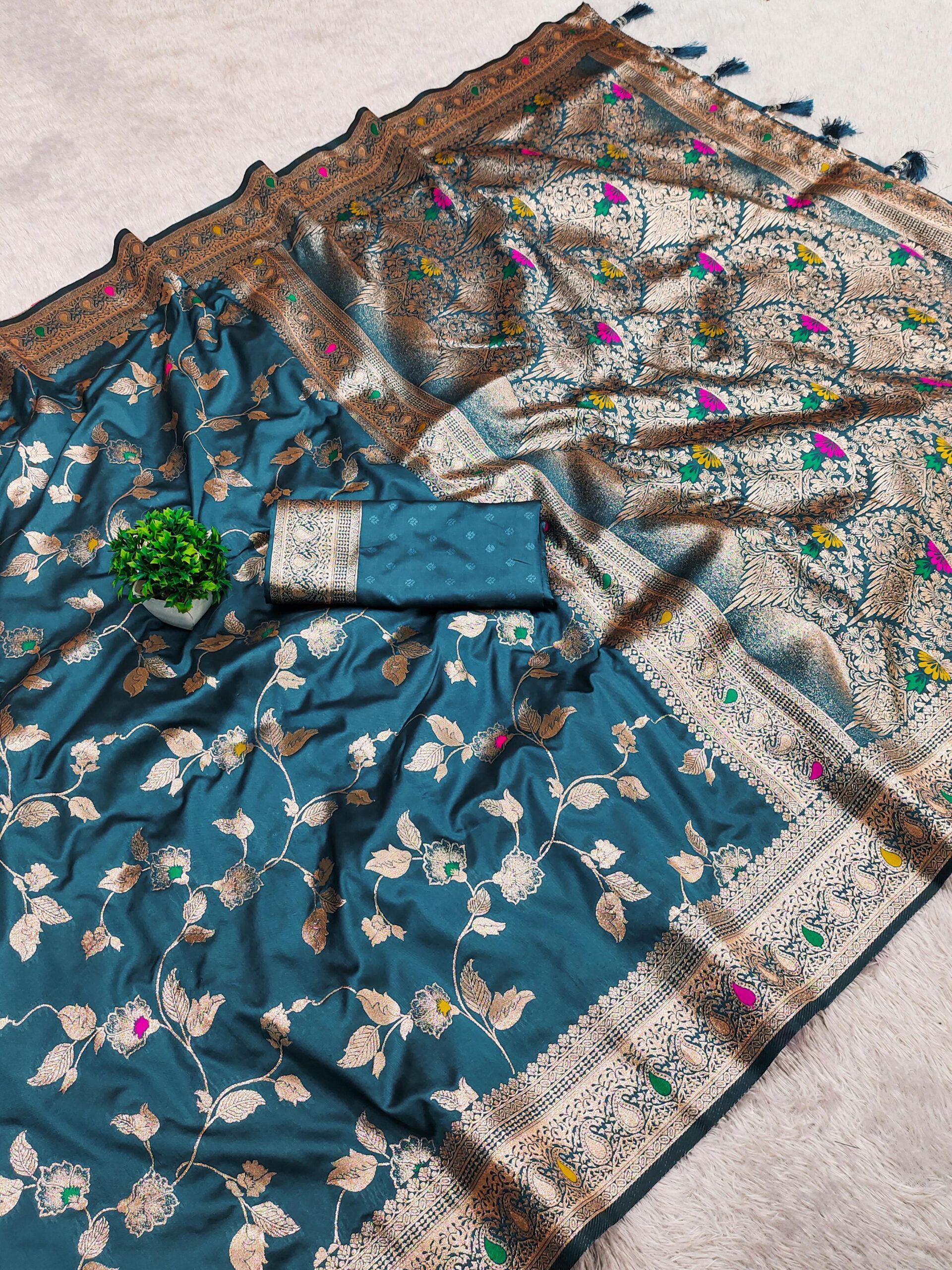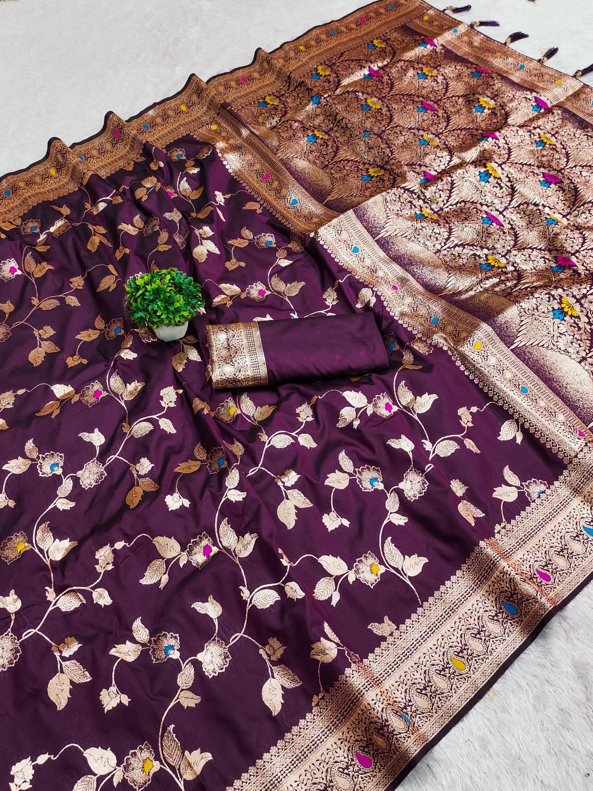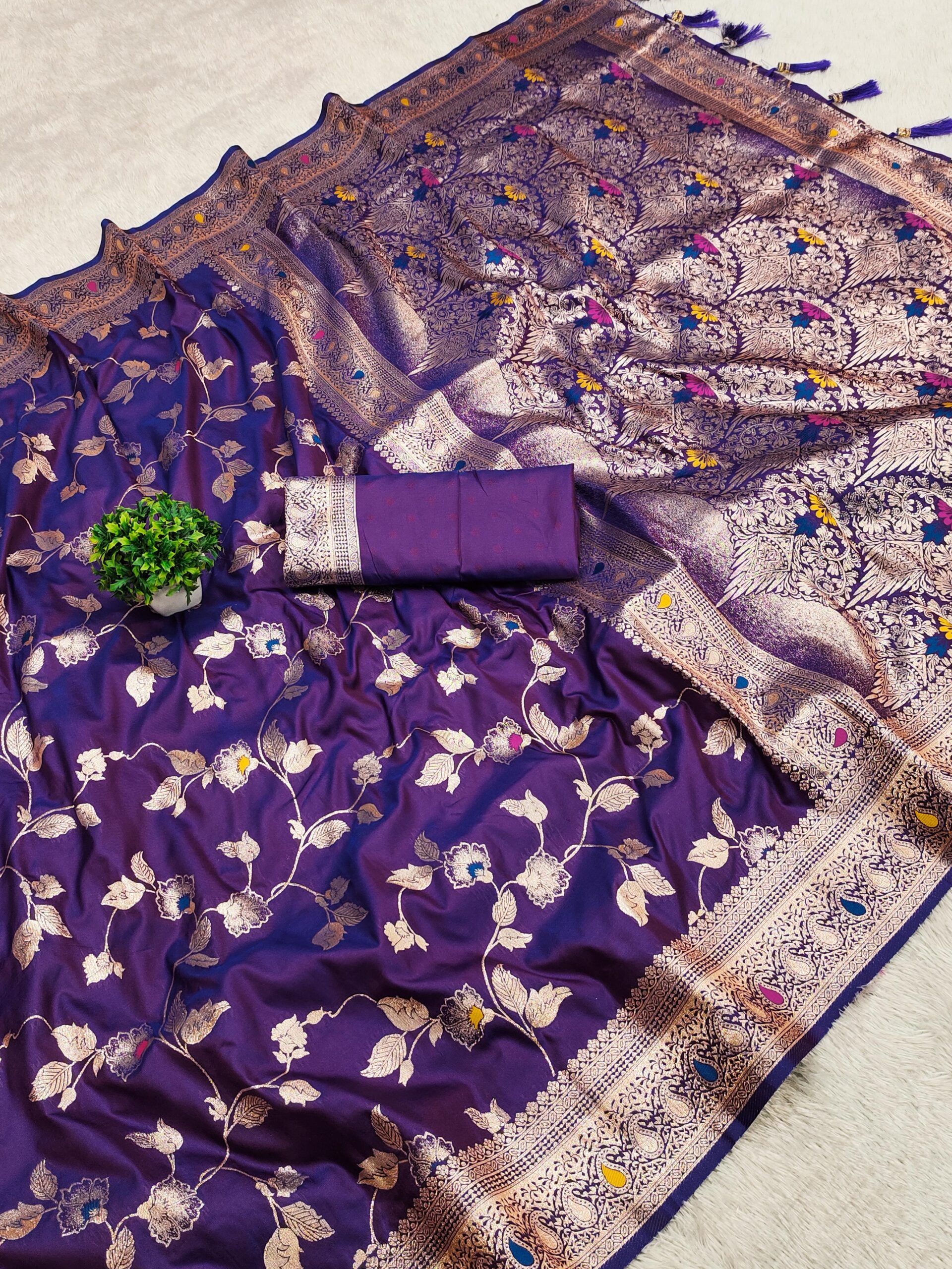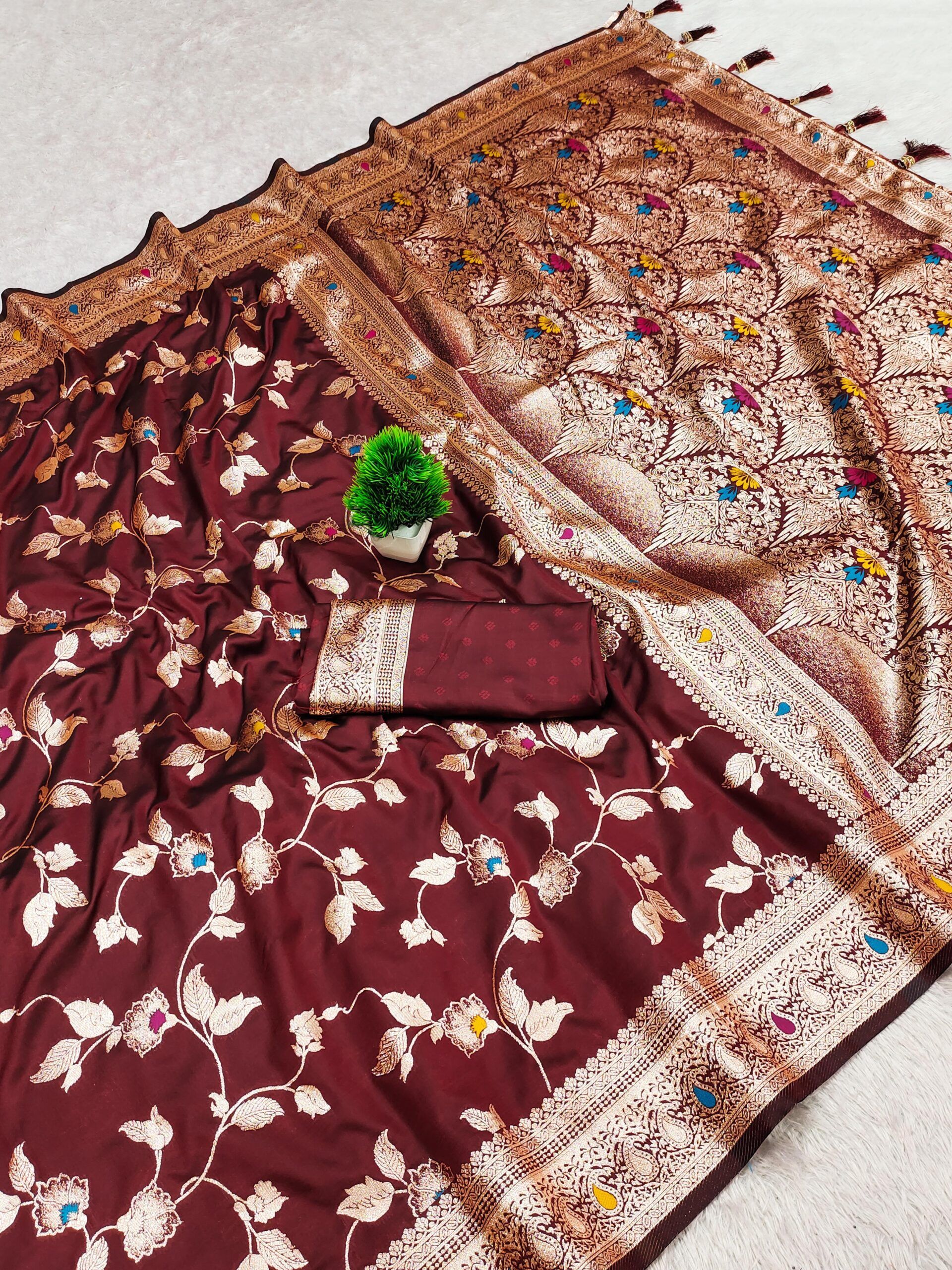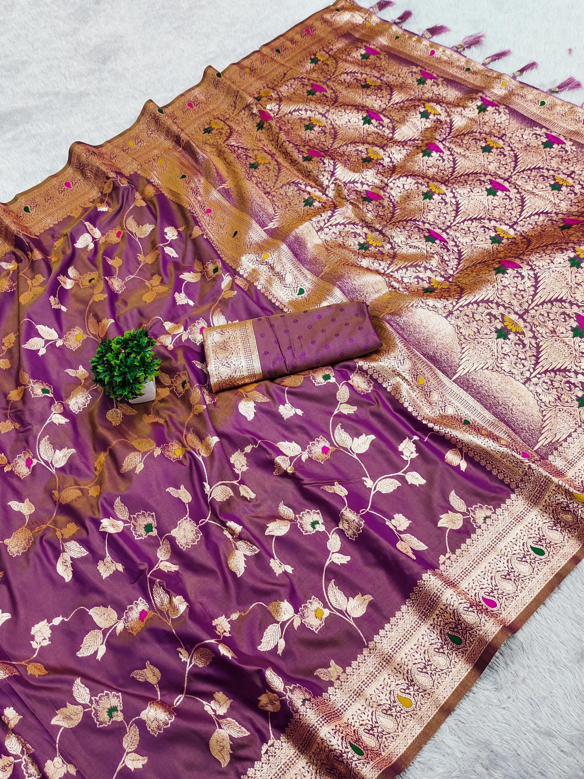 | Fabric: | Soft Banarasi silk saree having natural zari weaving small motifs meenakari design all over the saree & Zari weawing Rich meenakari pallu with Meenakari weawing border & Tassels attached at Pallu End. |