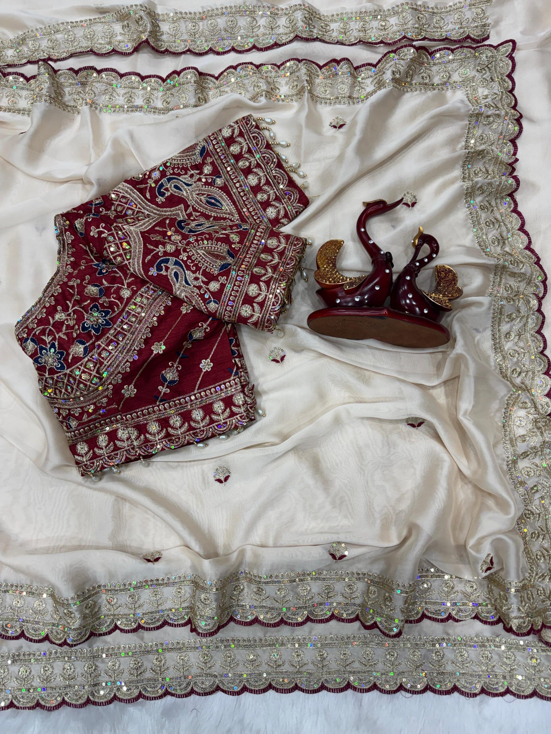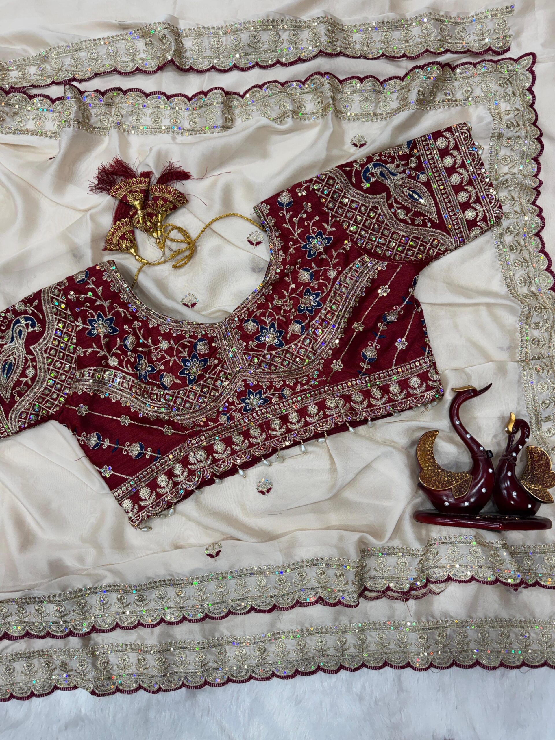 | Blouse: | Heavy embroidery work with Sequins work in heavy Banglori (FULL STITCH – Up to 44 ) |