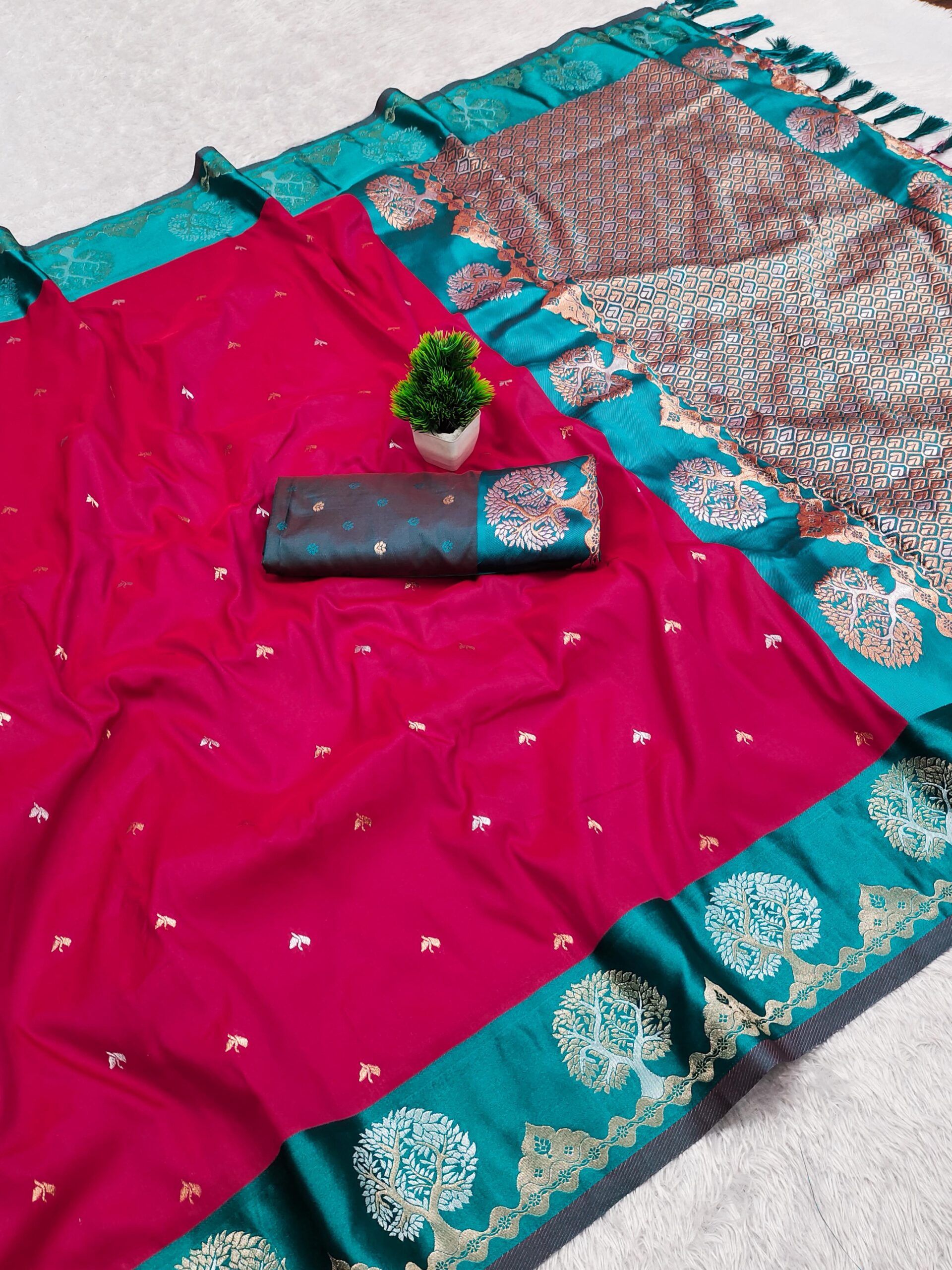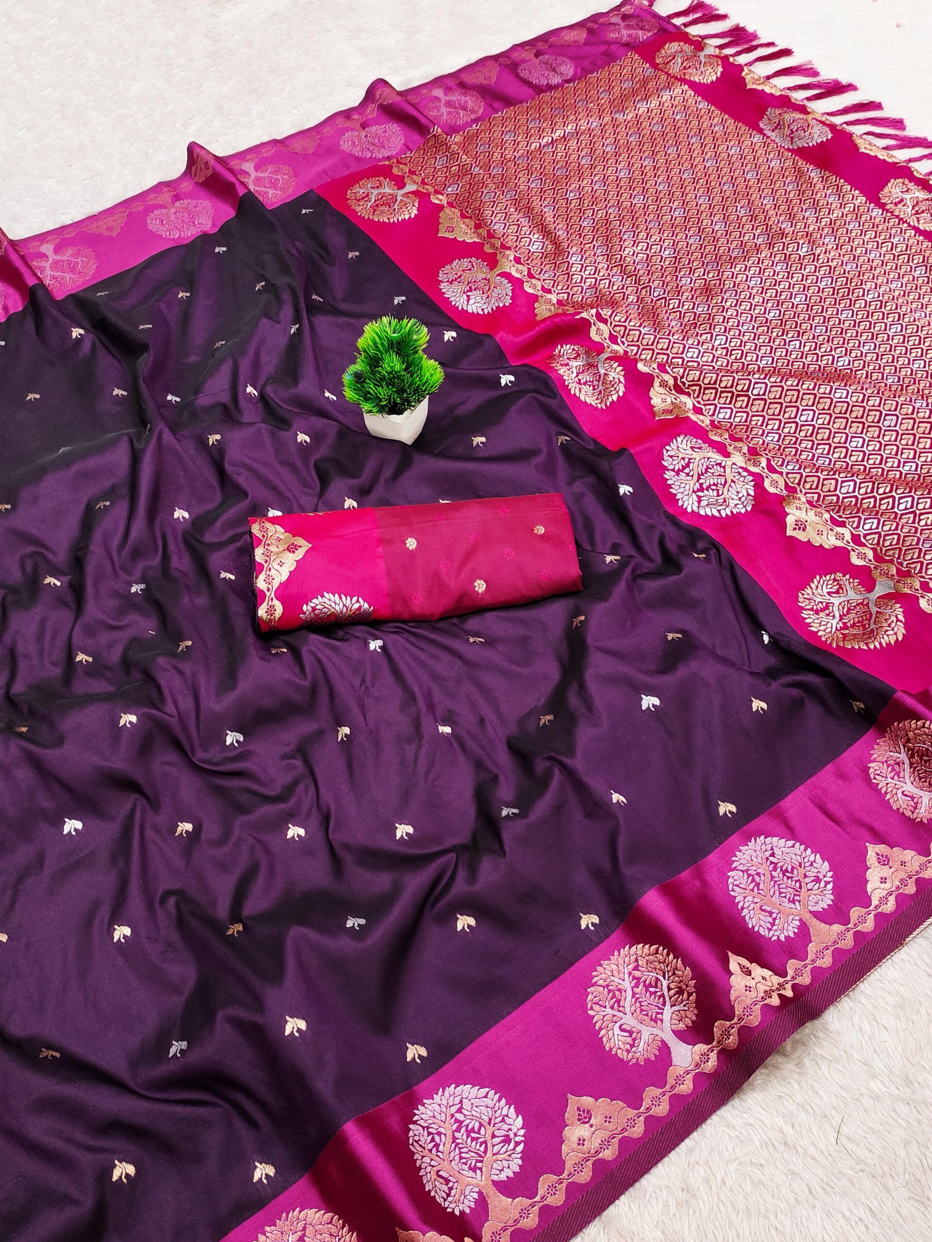 Work: Rich meenakari contrast pallu with Meenakari weawing pure satin border & Tassels attached at Pallu End.