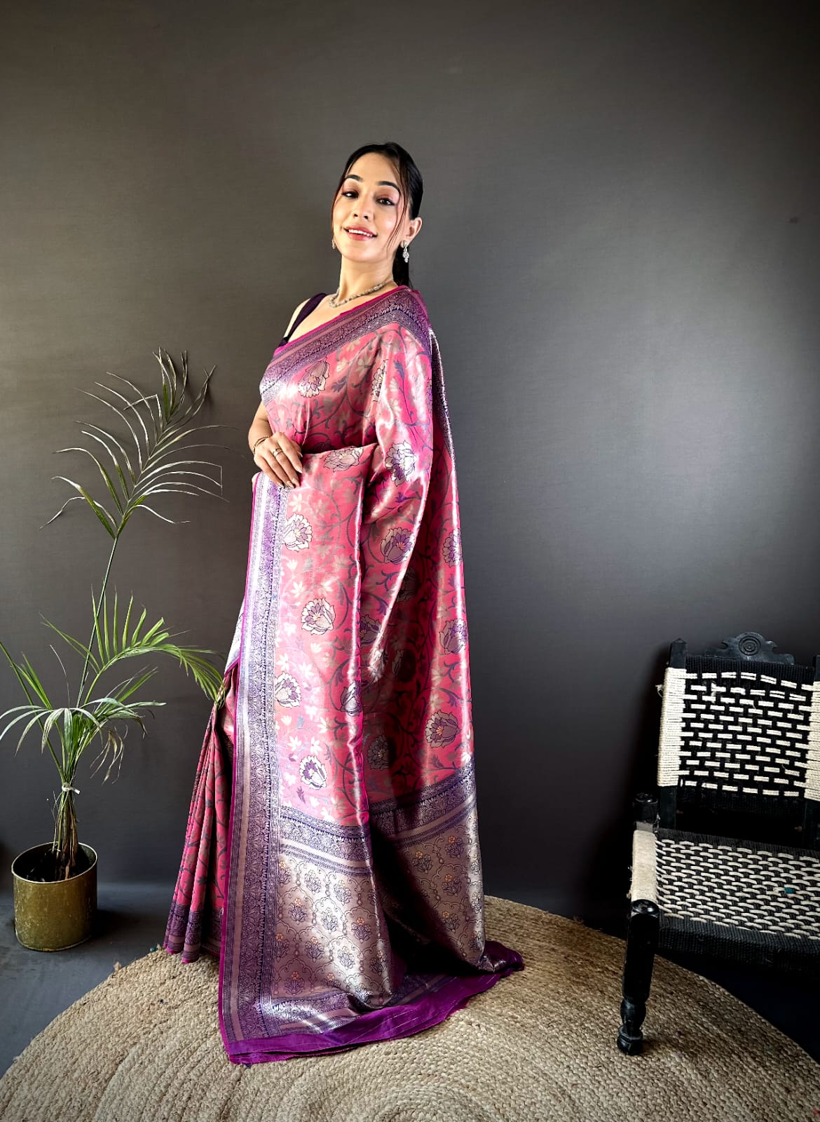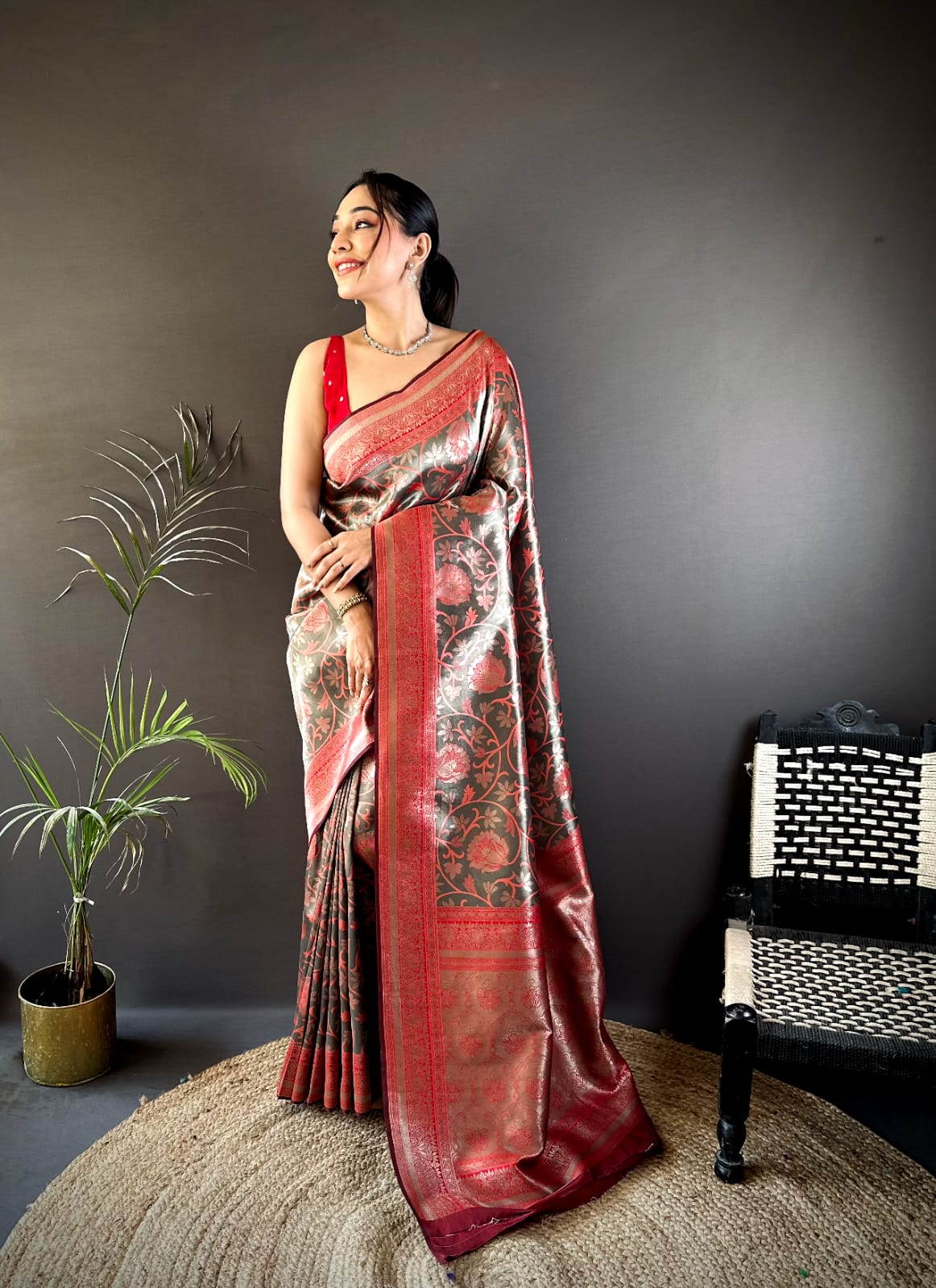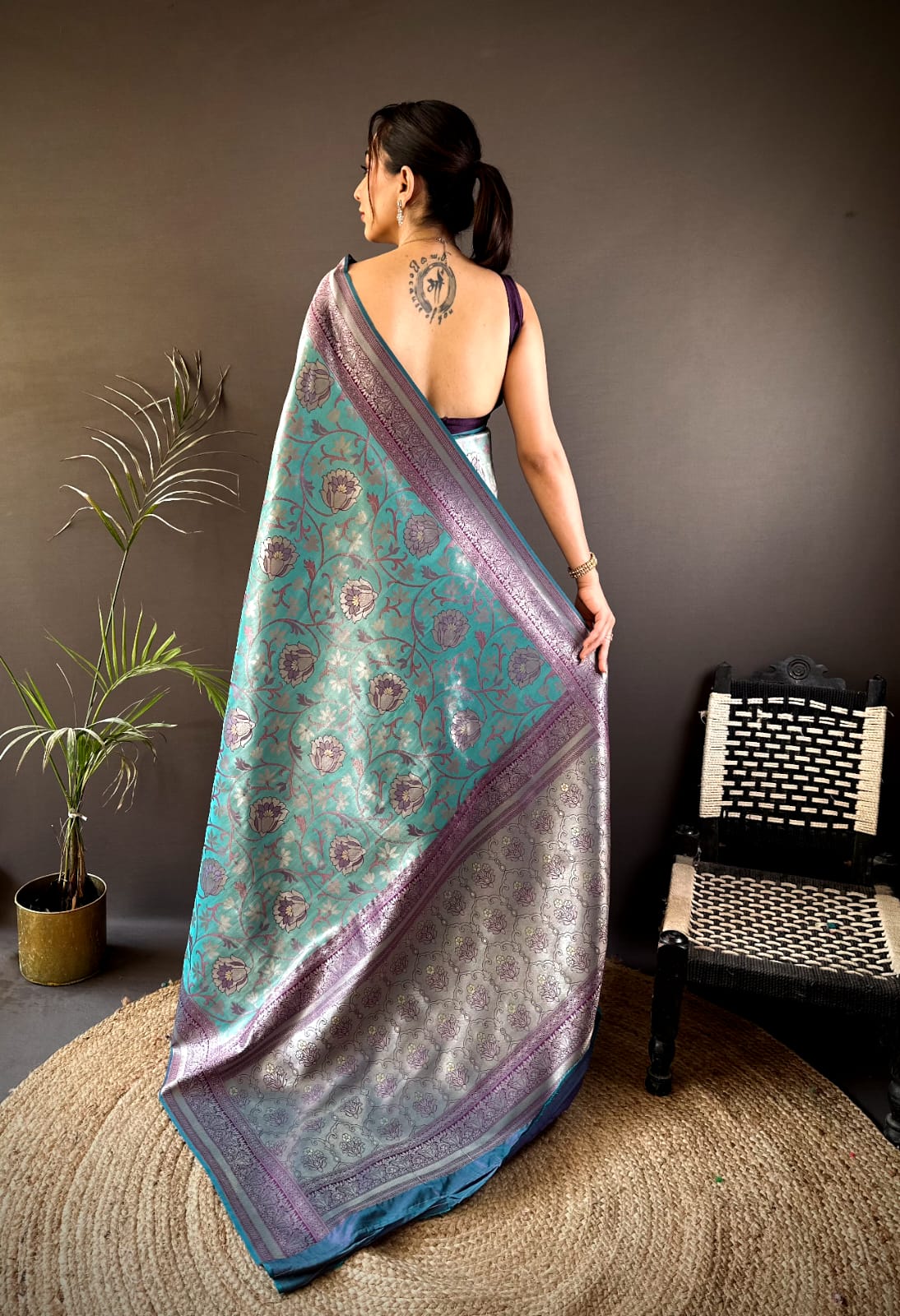 | Blouse: | Contrast color matching butti with weaving belt Border. |