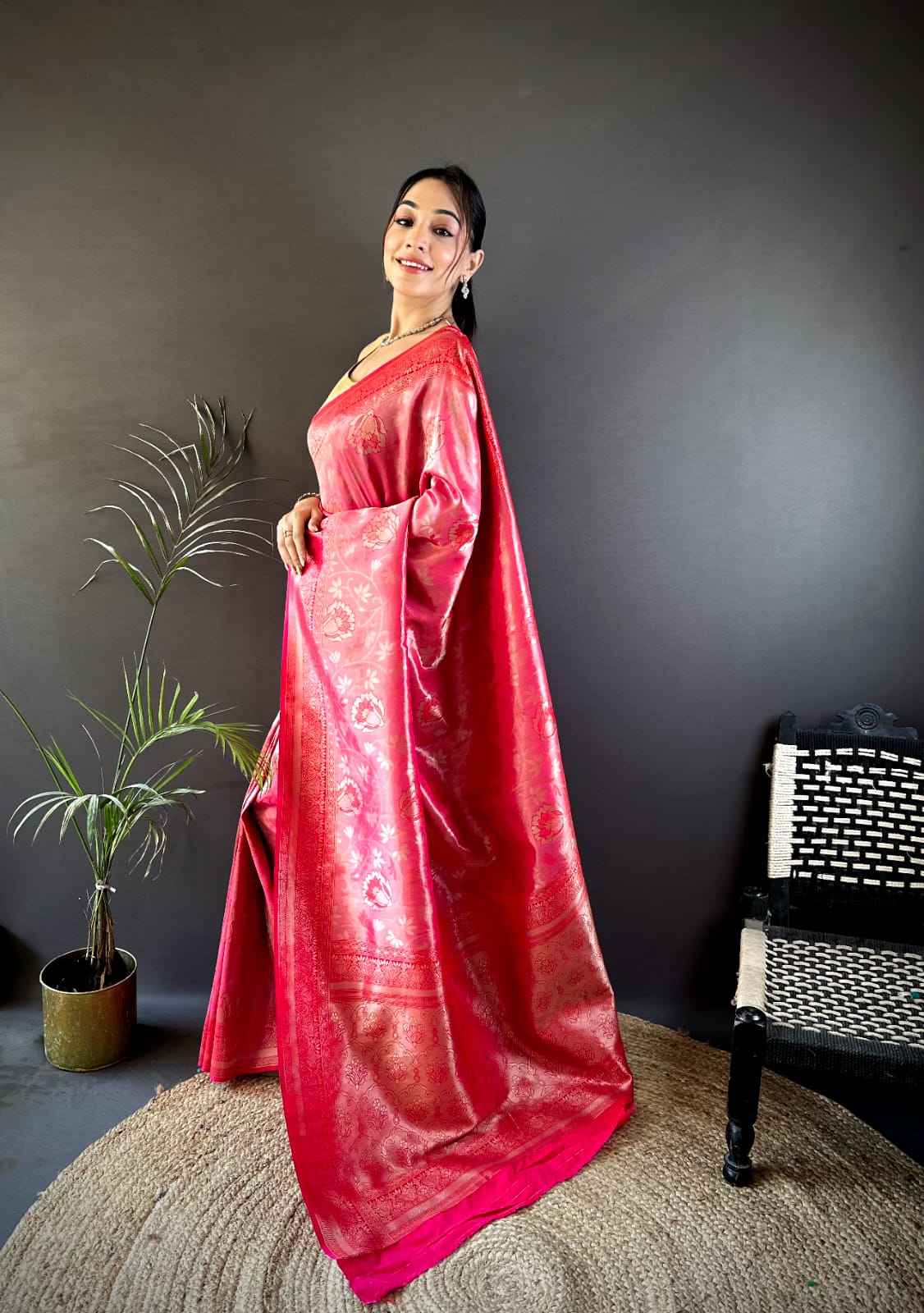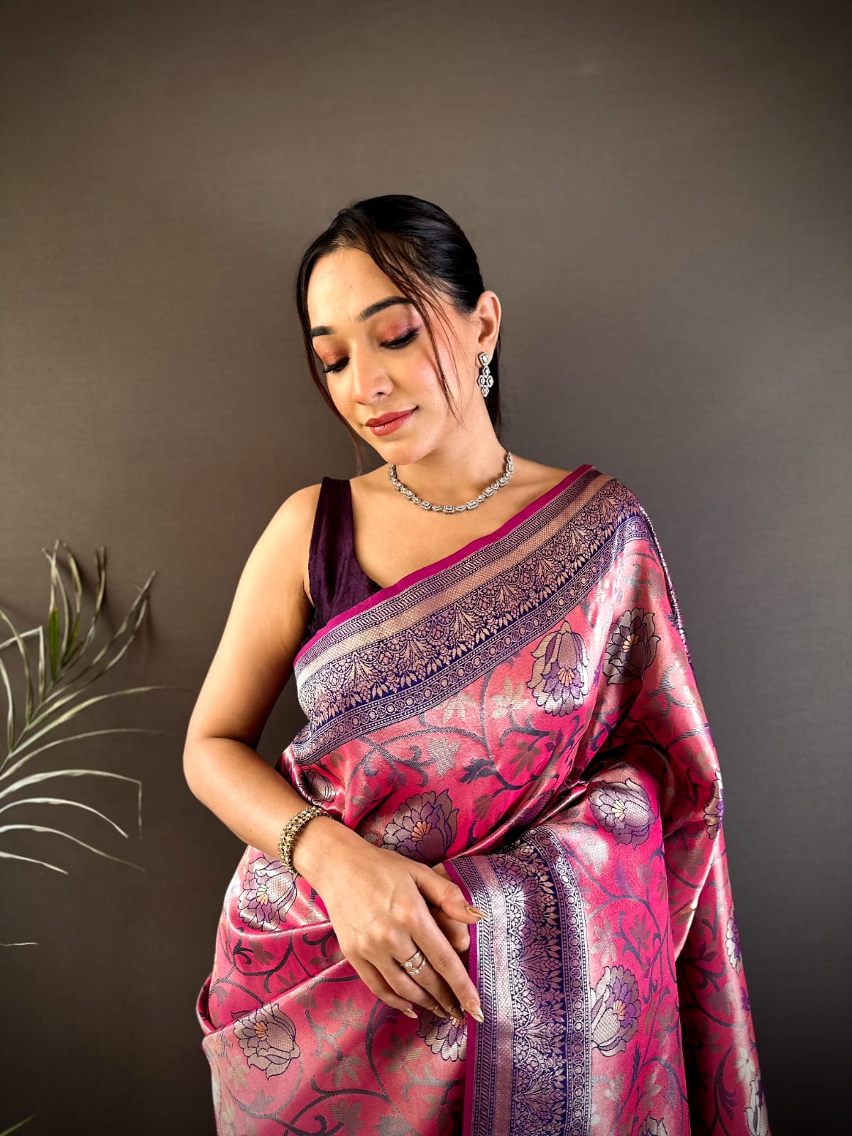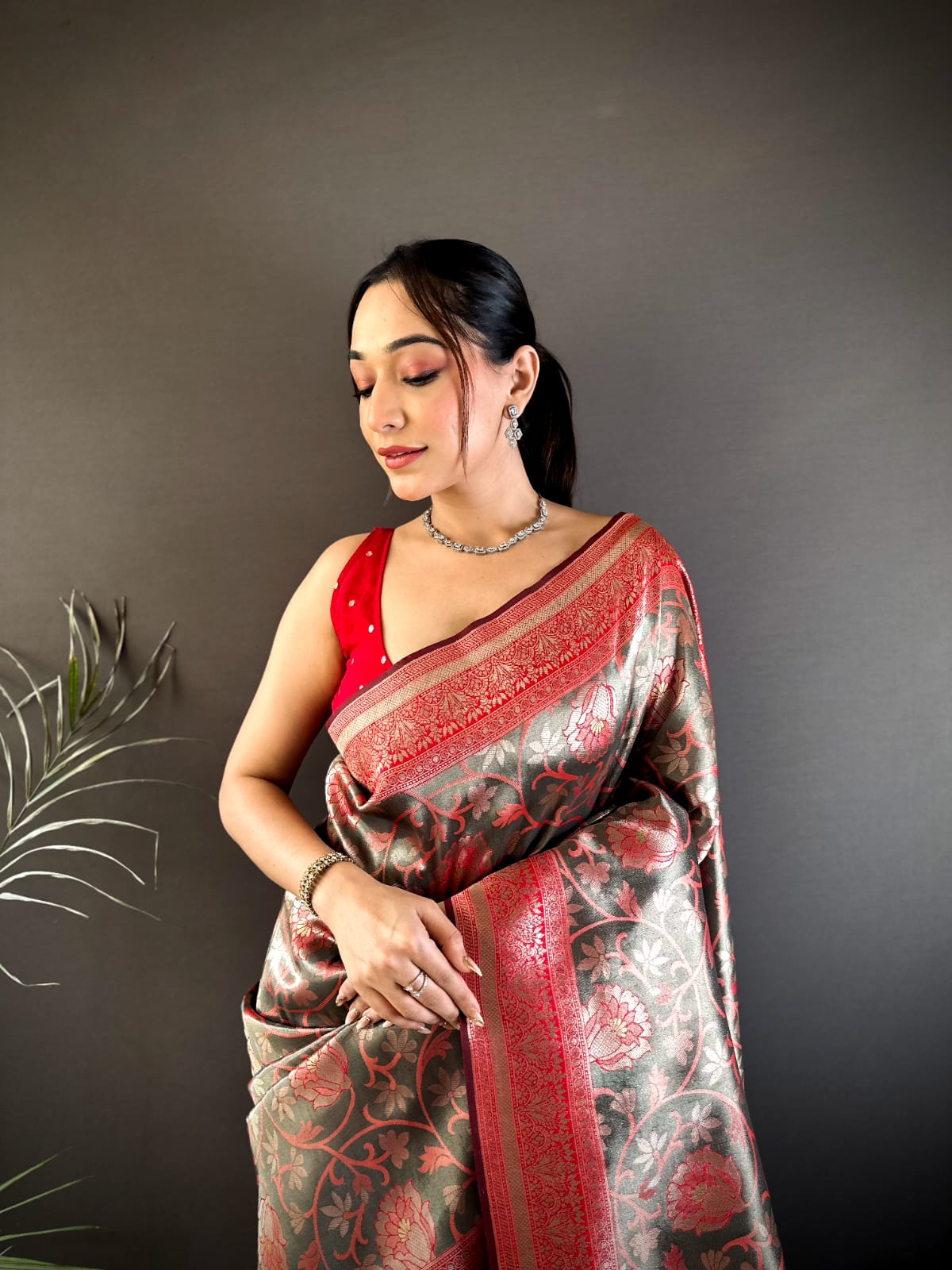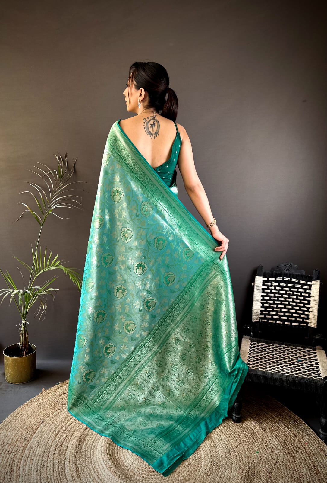 | Blouse: | Contrast color matching butti with weaving belt Border. |