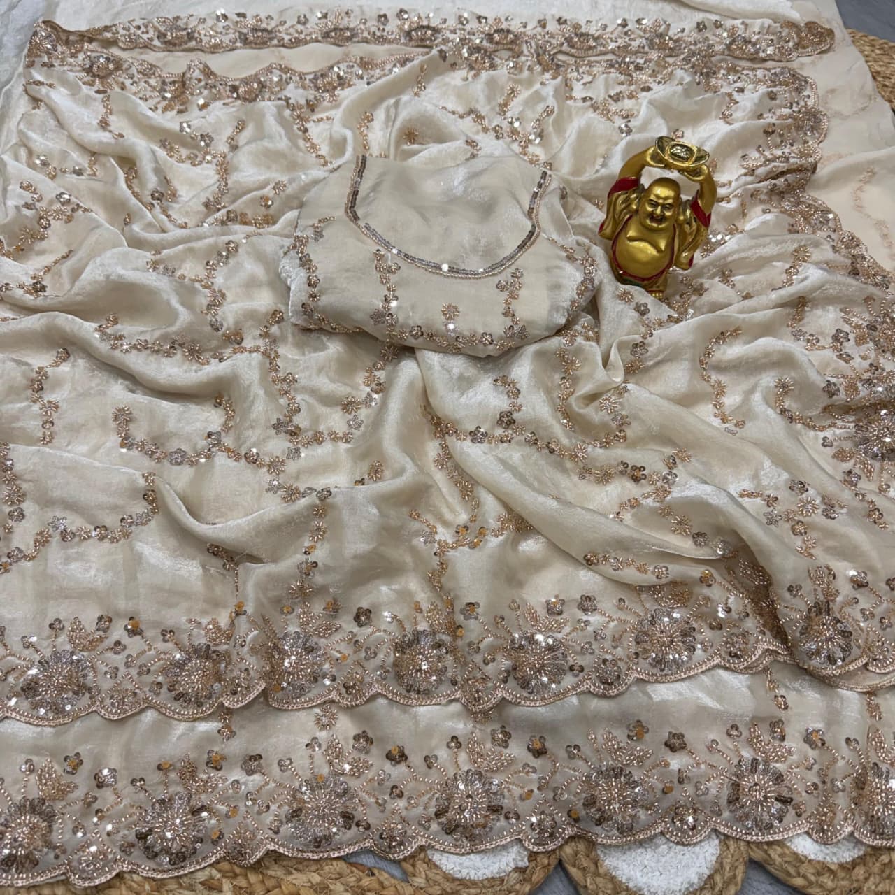 | Fabric: | On pure space silk sarees in velvet shine adorned with sequence and cutdana delicate handwork |