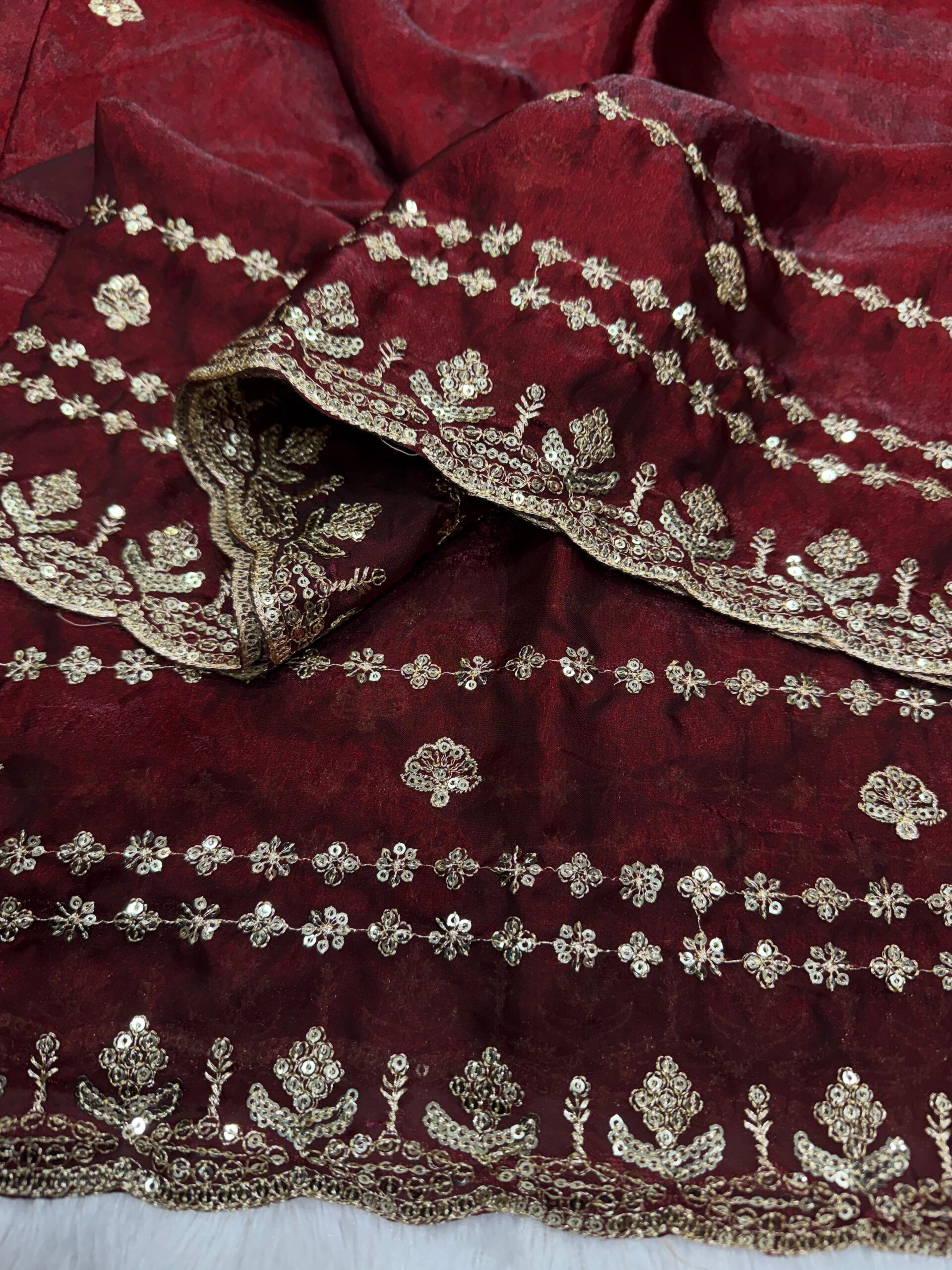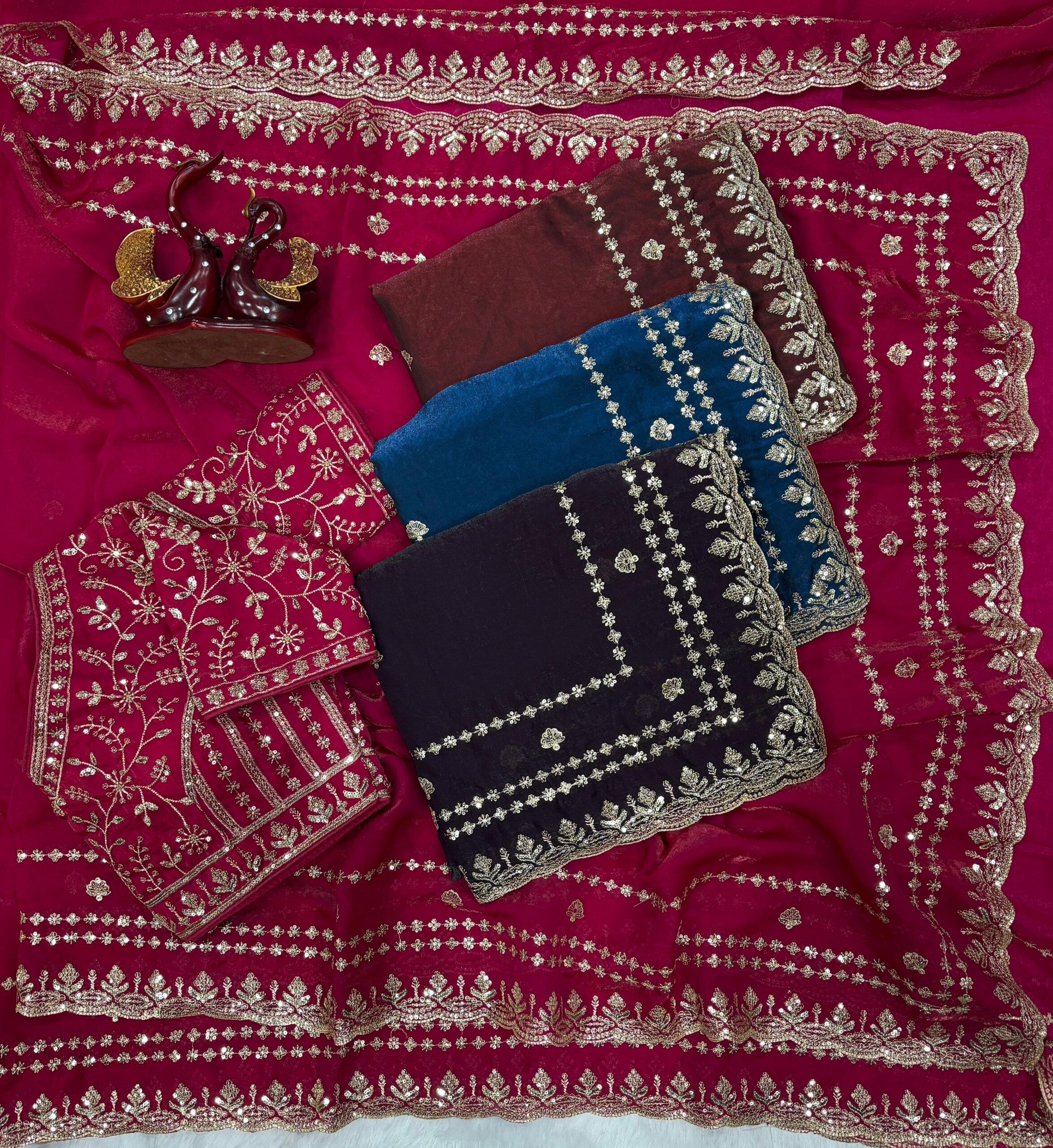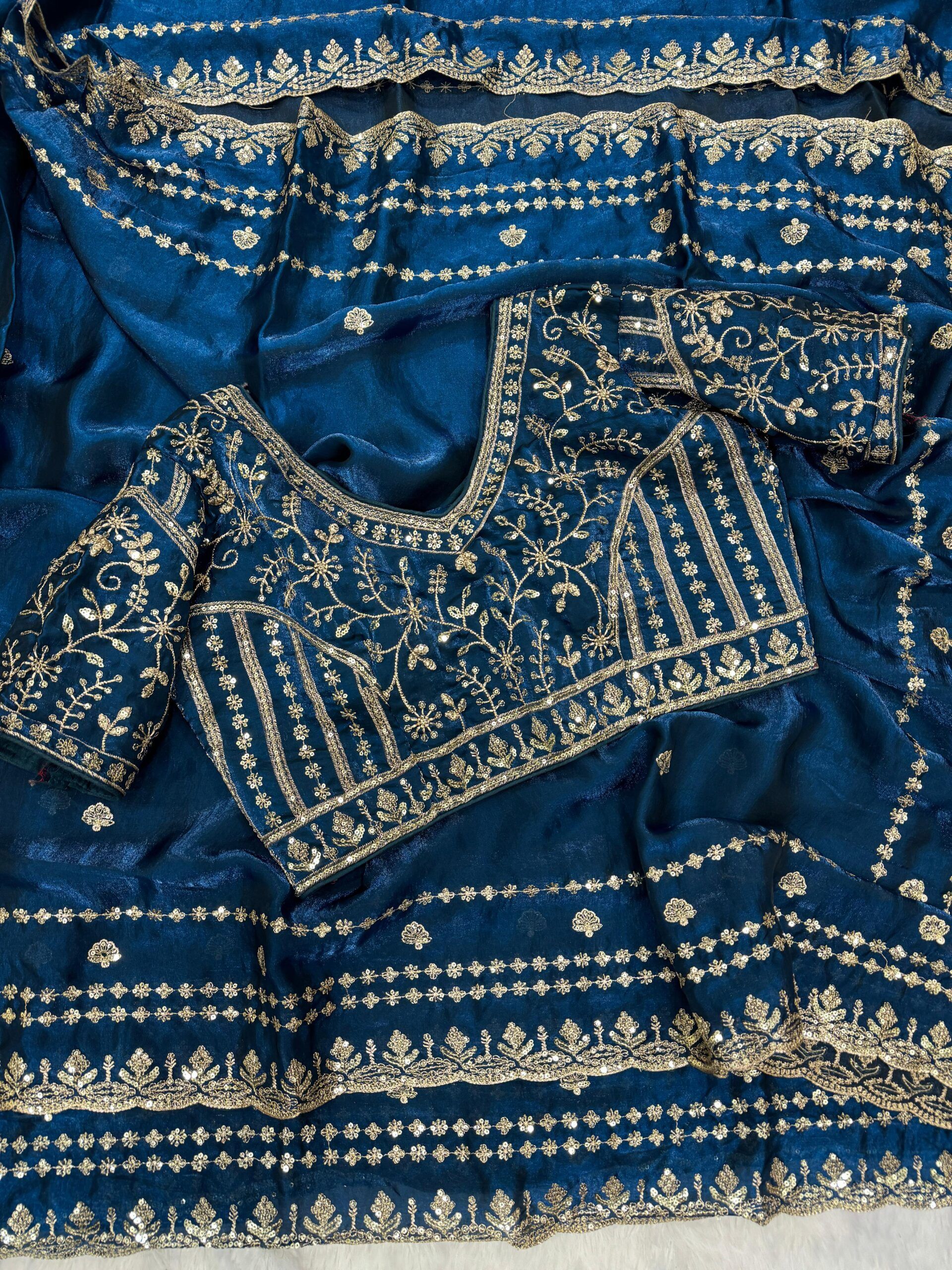 | Blouse: | Space Silk with sequins embroidery work ( FULL STITCH BLOUSE)Â BLOUSE SIZE – 38 Ready (Can alter Upto 44) |