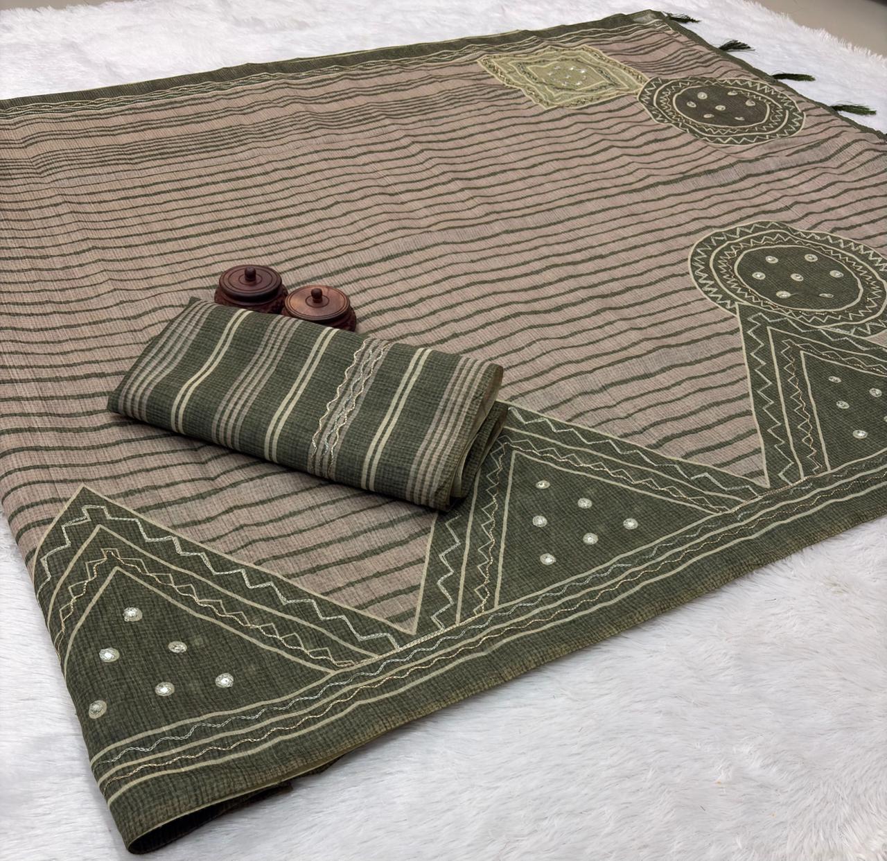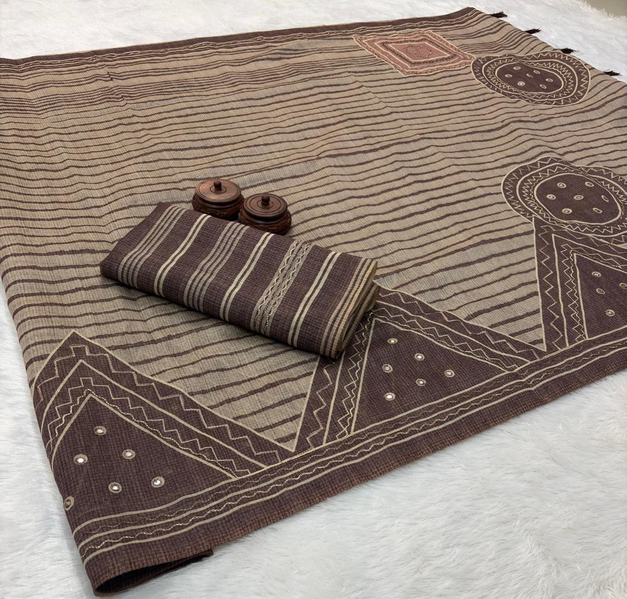 | Name: | Soft Spun Slub Cotton Mirror handwork Saree |