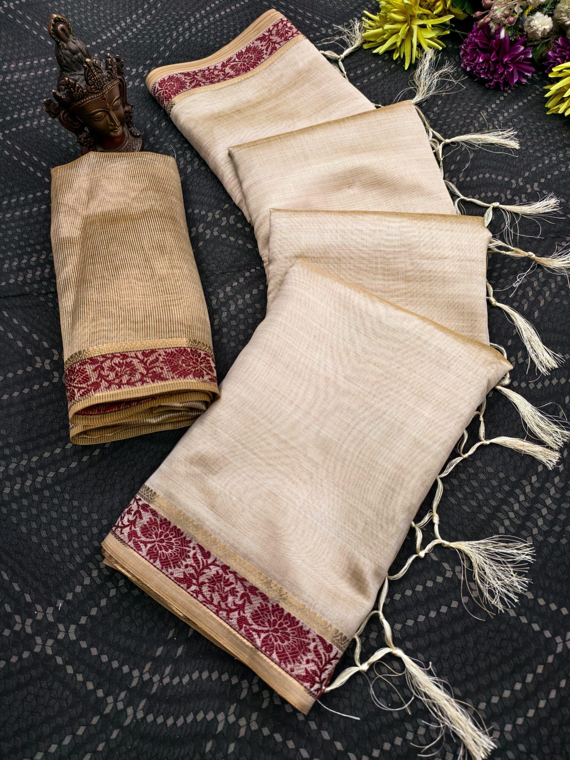 | Fabric: | Soft tussar silk saree with self weaving design all over the saree & zari weaving Rich pallu |