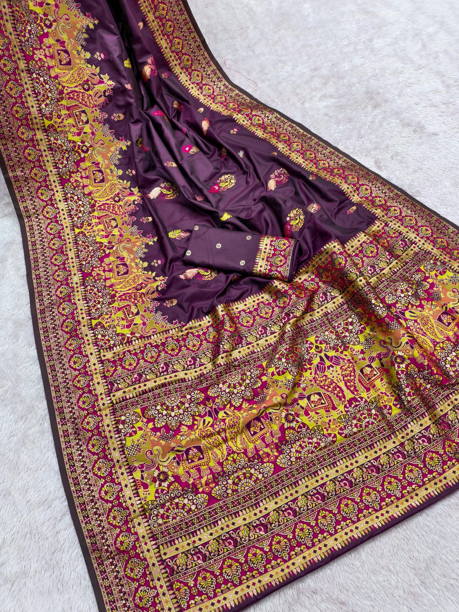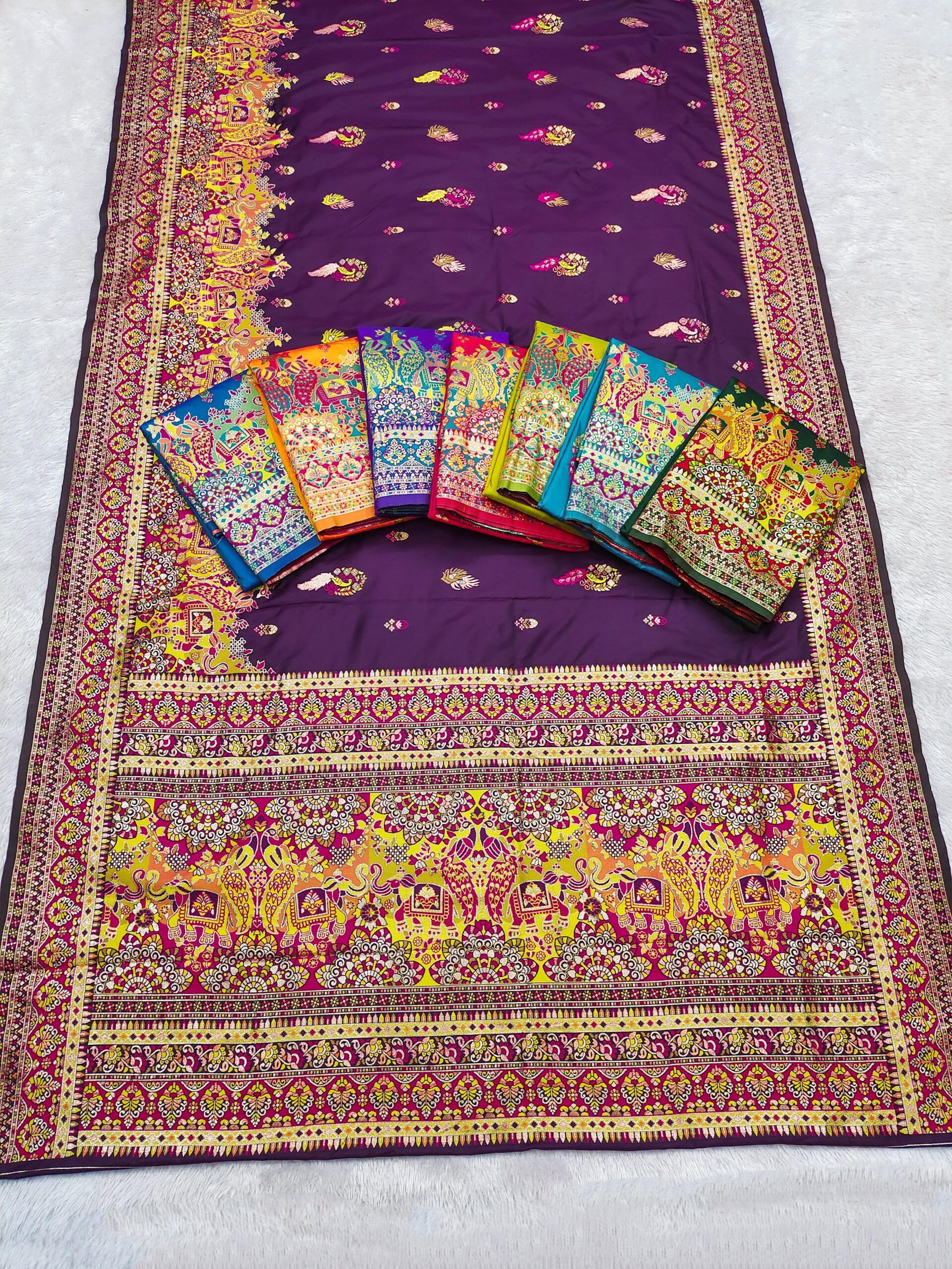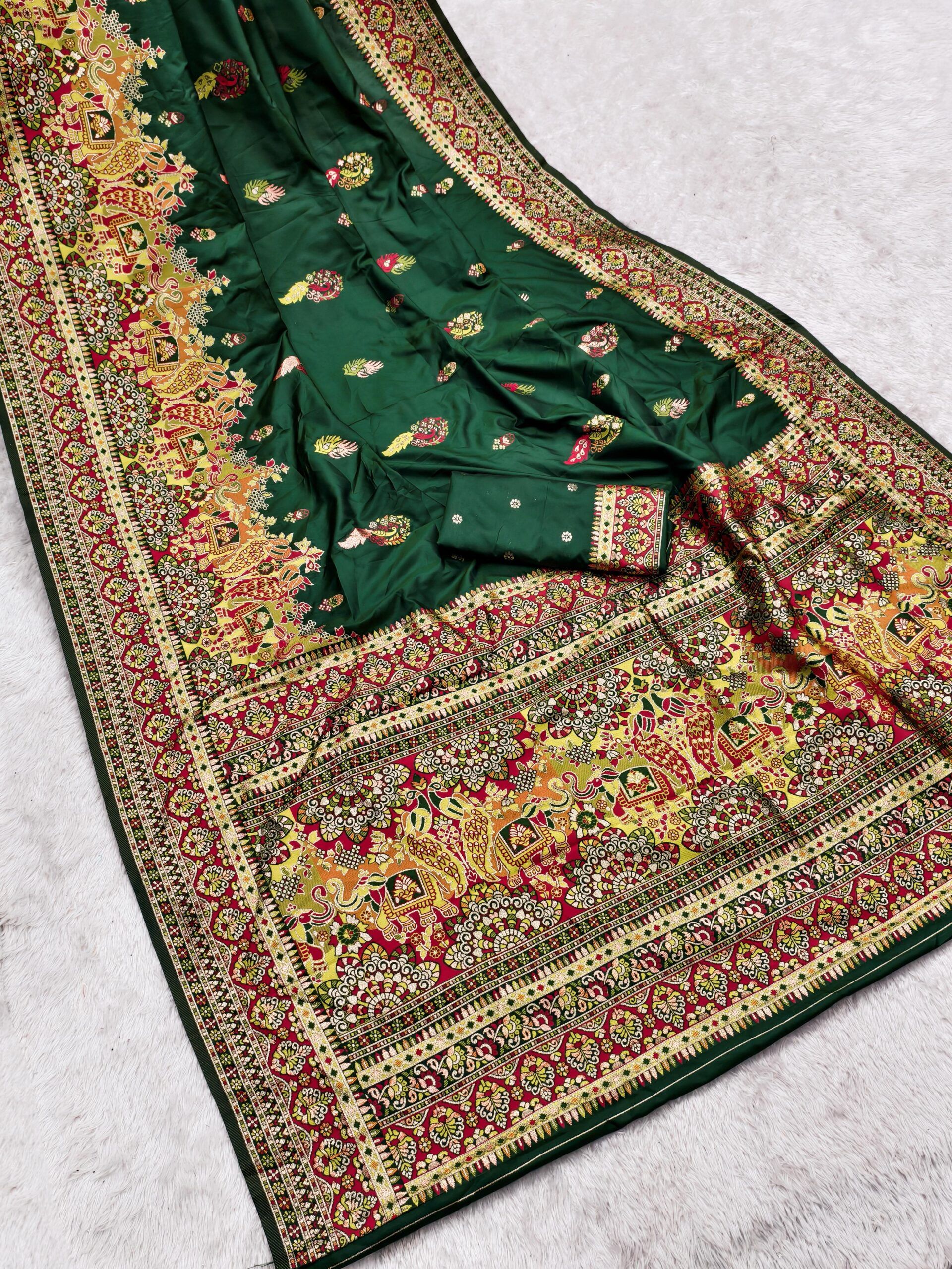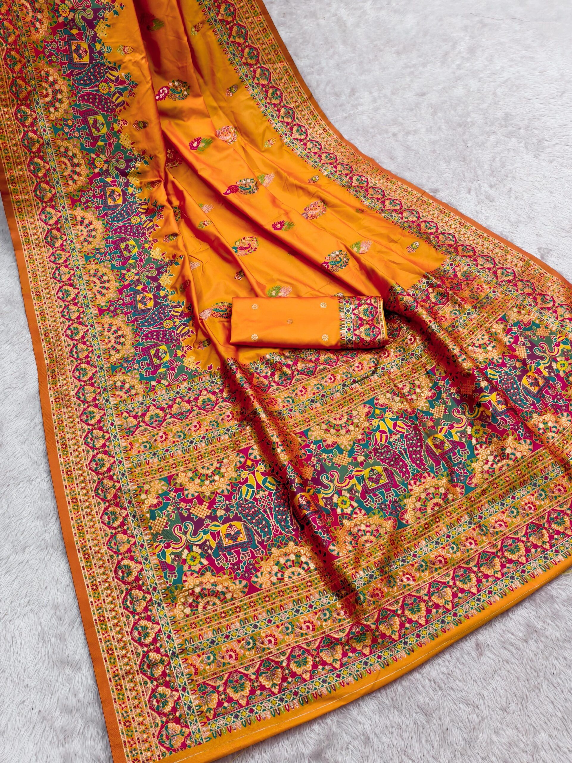 | Fabric: | Stunning Pashmina Silk Saree featuring a rich, smooth body paired with a beautifully detailed multicolor paisley border and pallu featuring elephant and floral motifs, which is a classic Paithani inspired design. Perfect for festive and special occasions. |