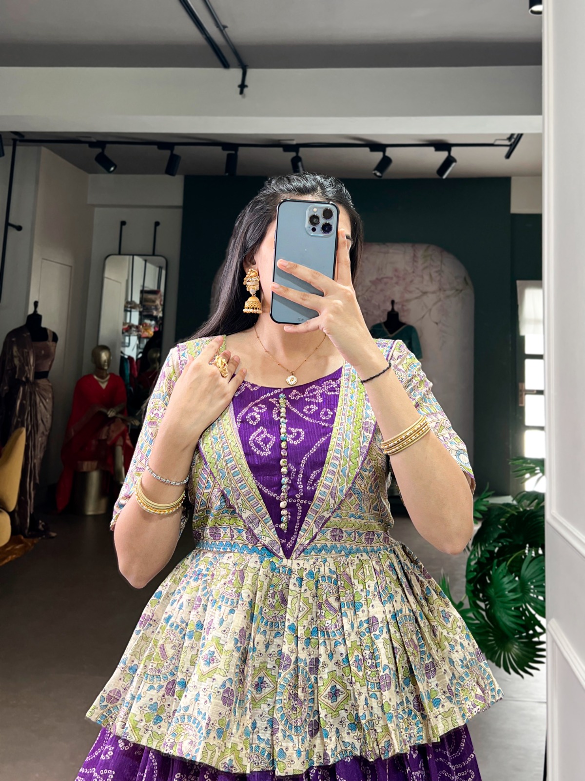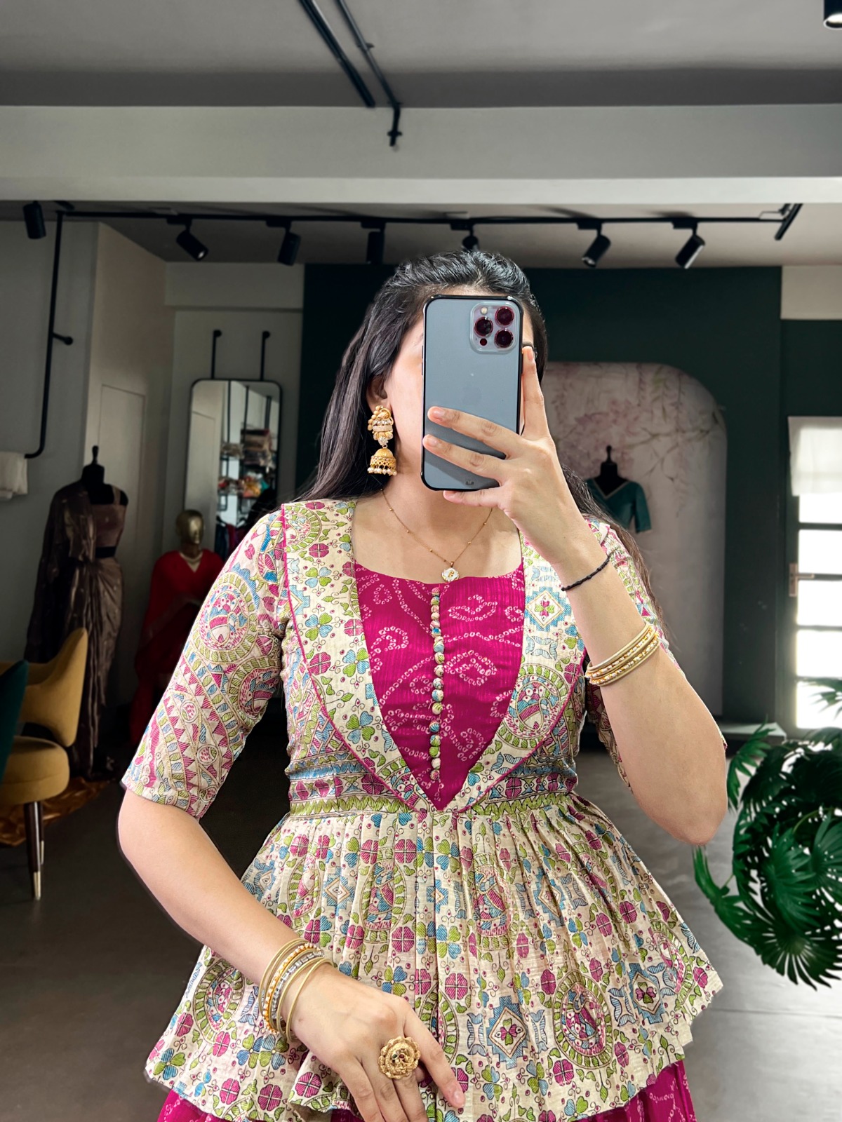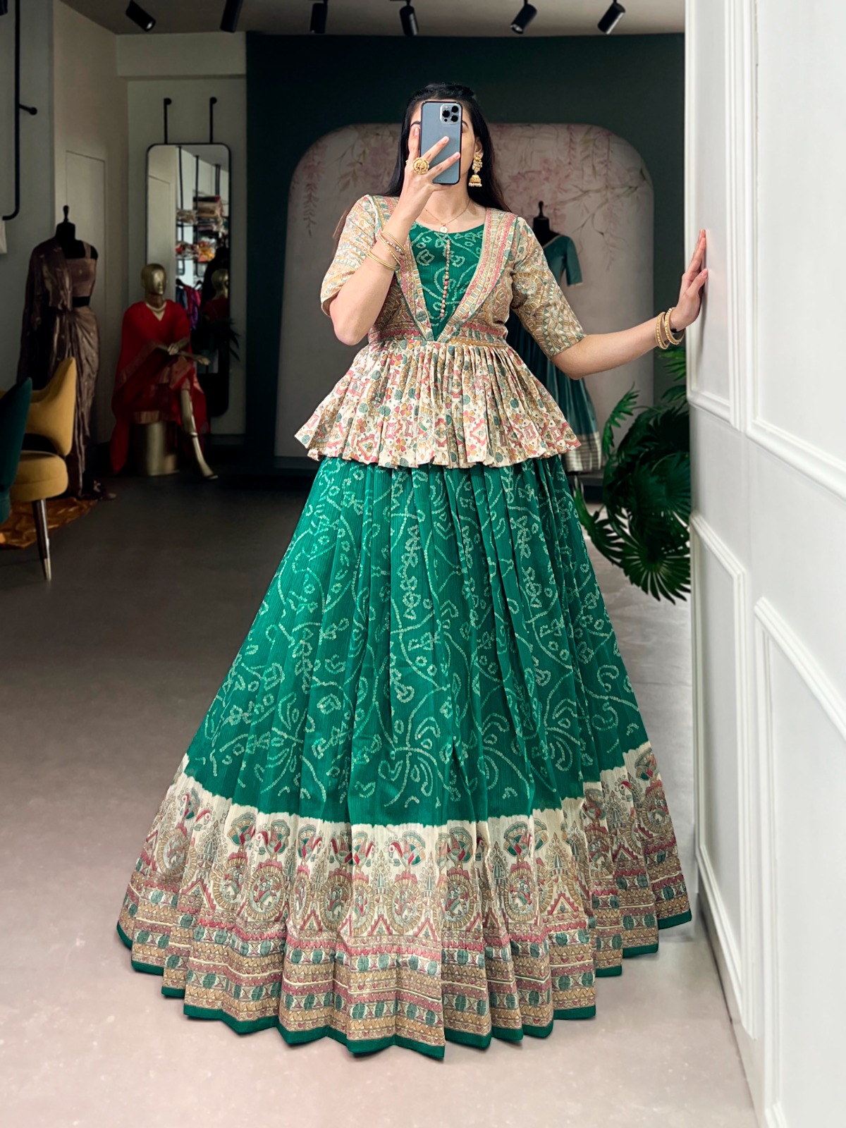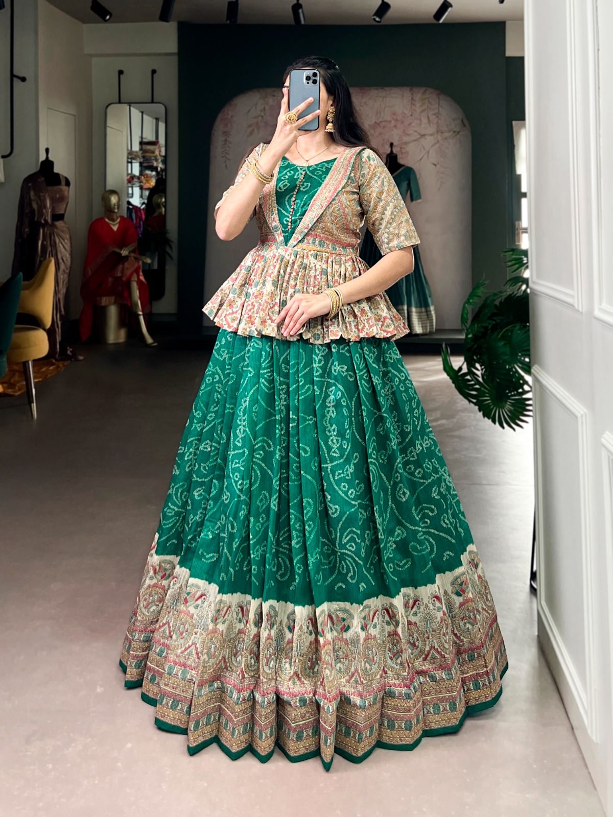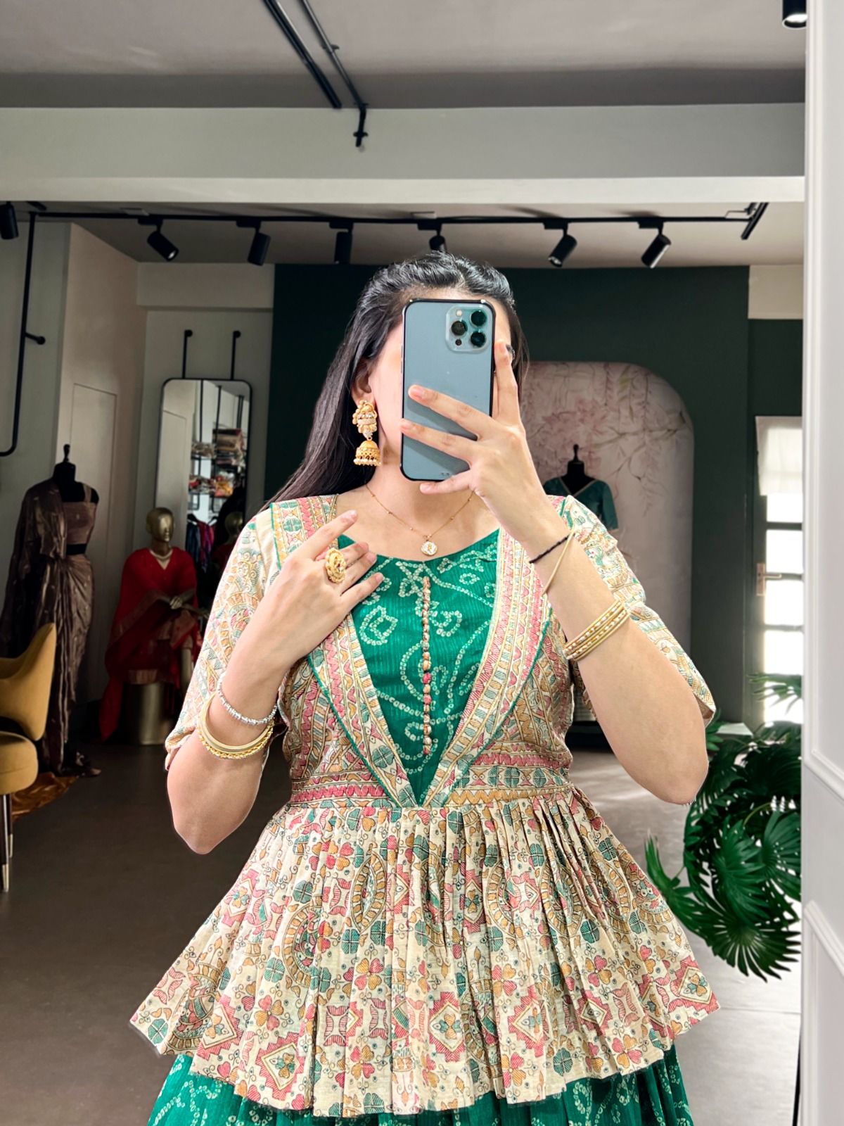 | Lehenga (Stitched) | Lehenga Fabric : Green Silk Lehenga Work : Fusion Print Of Madhubani And Bandhej Lehenga Waist : SUPPORTED UP TO 42 Lehenga Closer : Drawstring with Zip Stitching : Stitched With Canvas Length : 41 Flair : 4 Meter Inner : Micro Crepe |