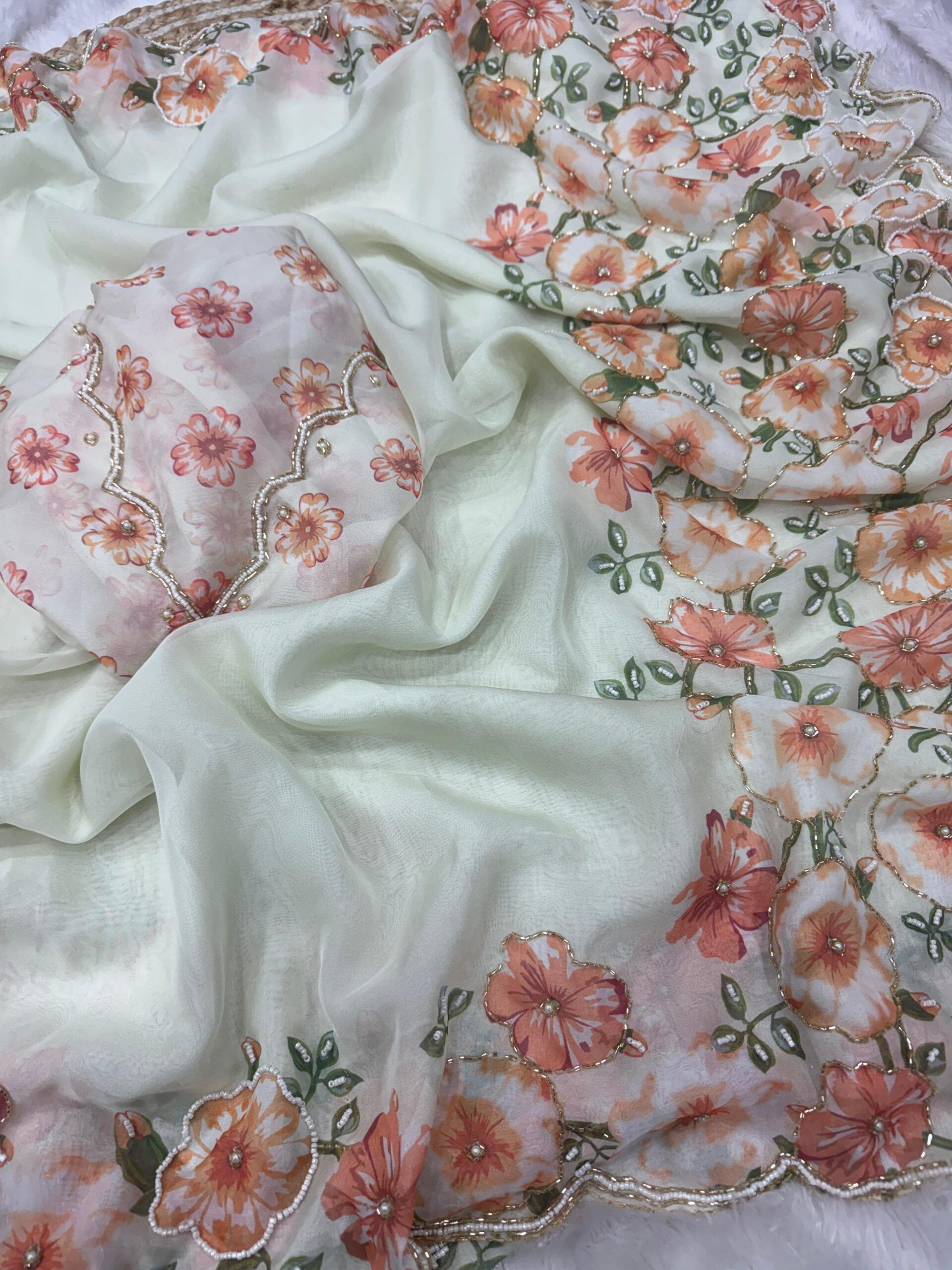 Blouse: Beautiful floral print with beads and katdana handwork with sleeves