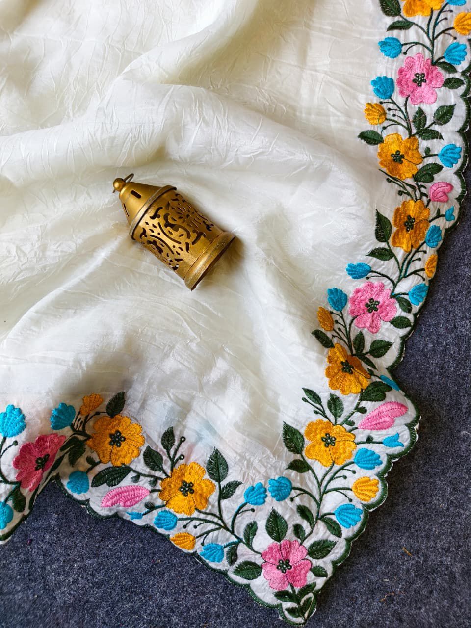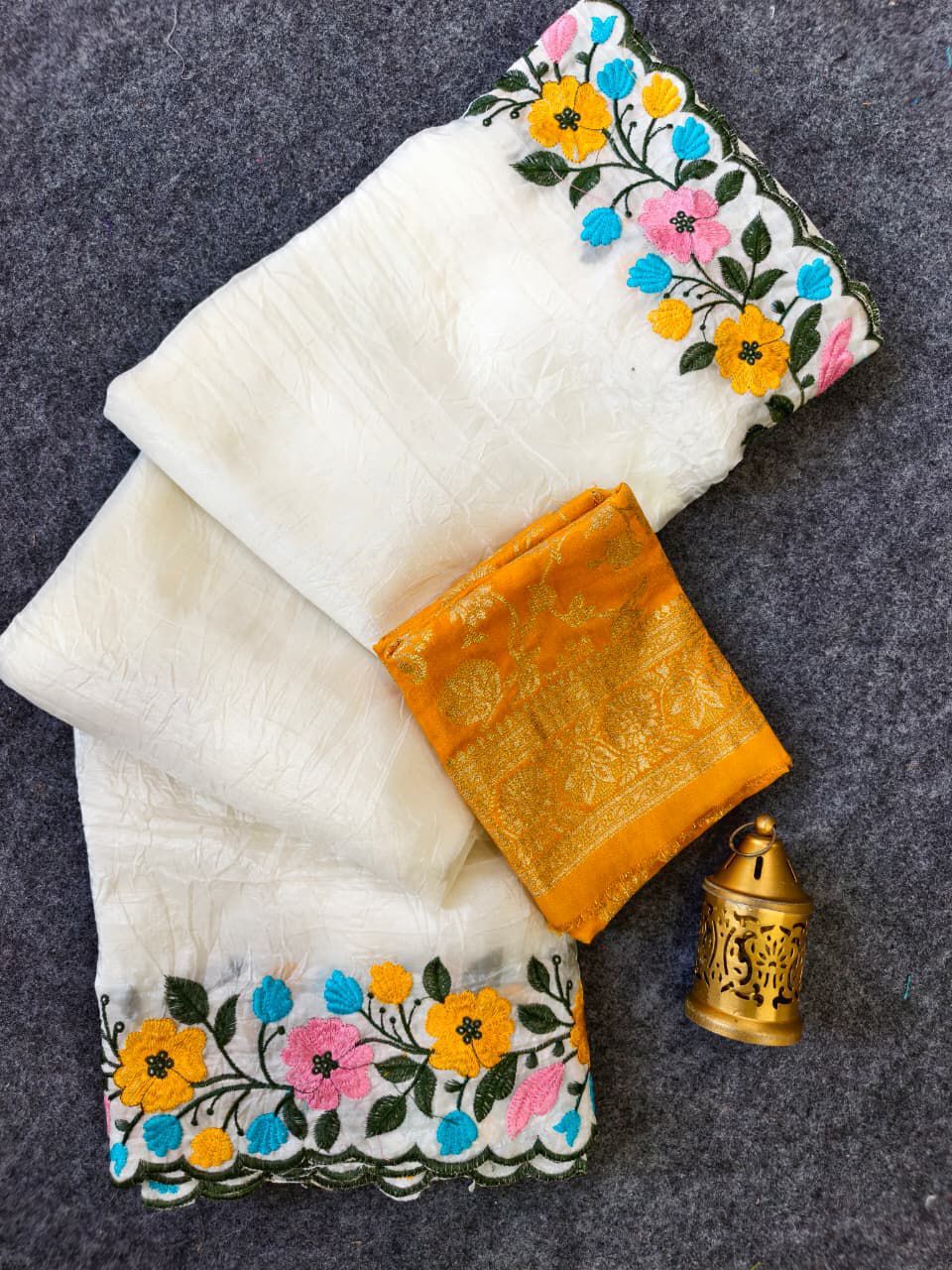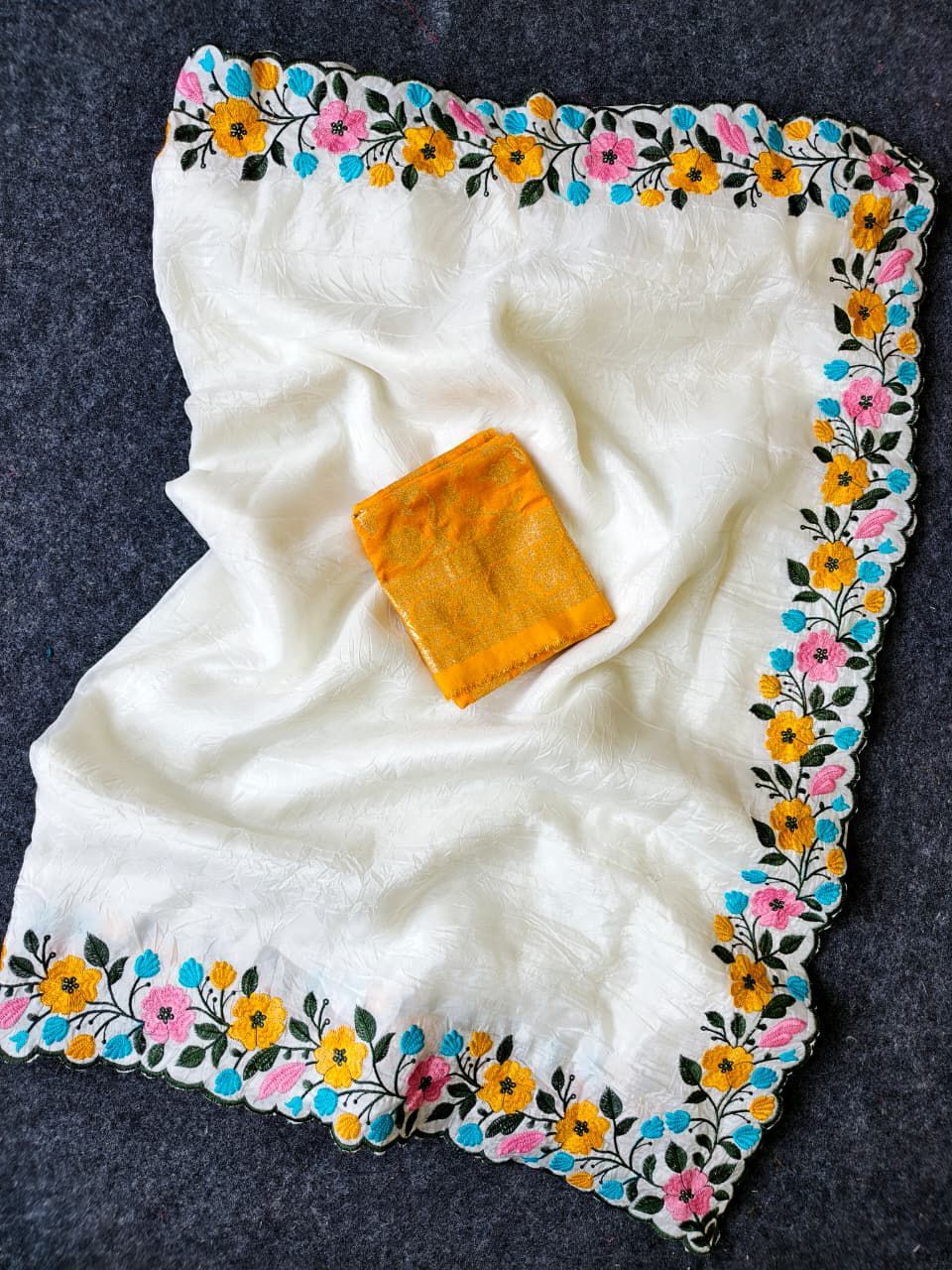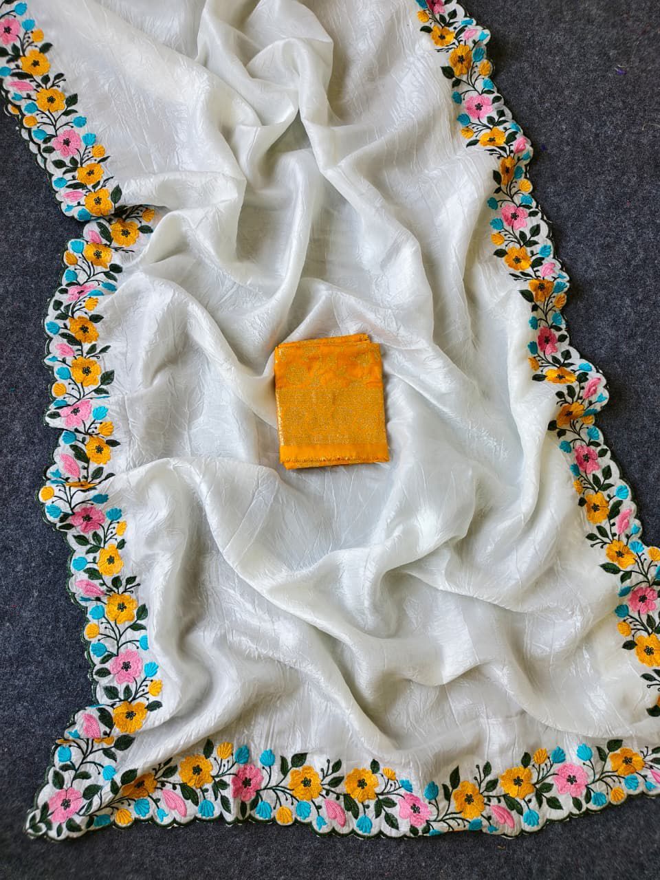 | Fabric: | Pure crush fabric saree in elegant white, beautifully enhanced with intricate embroidered cutwork. Features a stunning multicolor floral panel in shades of yellow, blue, pink & green, finished with a delicate cutwork border for a graceful look |